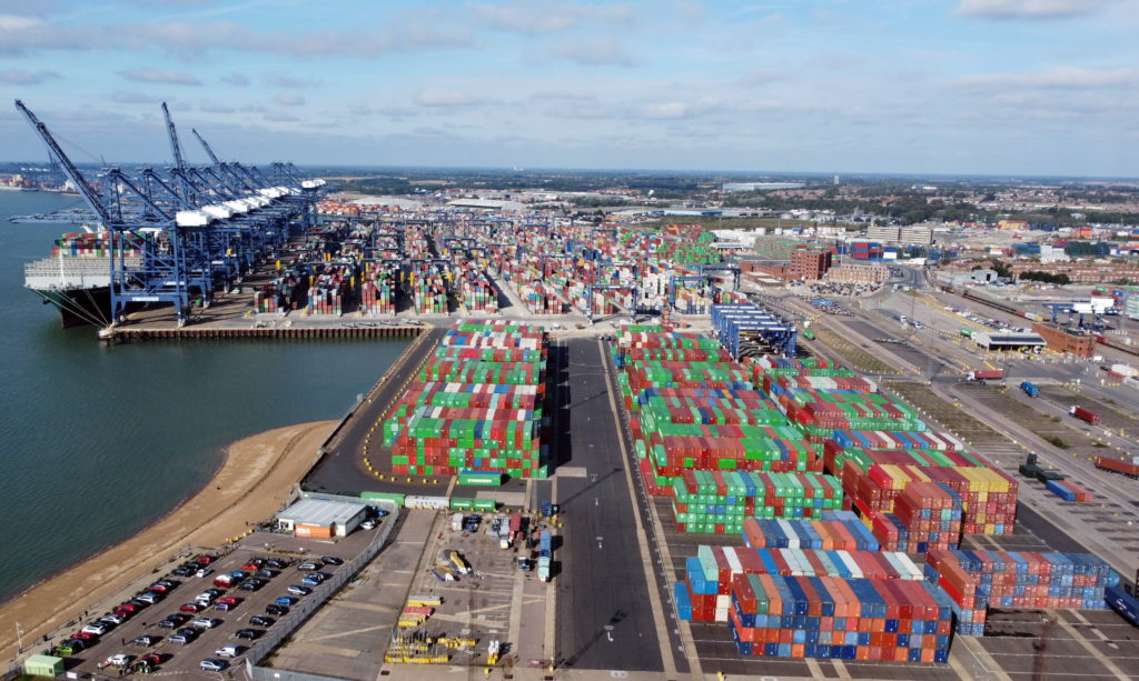 A view shows stacked shipping containers at the port of Felixstowe, Britain, October 13, 2021. REUTERS/Hannah McKay