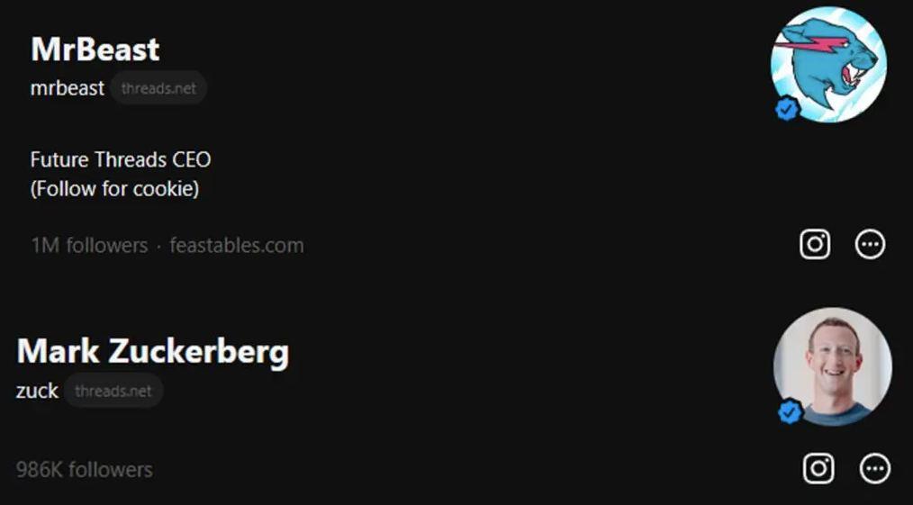 បណ្តាញសង្គម Threads របស់លោក Mark Zuckerberg ត្រូវបានគេដឹងថា ជាកម្មវិធីមួយដែលបង្កើតឡើងឡើង ដើម្បីប្រកួតប្រជែងជាមួយបណ្តាញសង្គម Twitter របស់លោក Elon Musk។ ជាមួយគ្នានេះ ត្រឹមតែរយៈពេលប៉ុន្មានម៉ោងប៉ុណ្ណោះ ក្រោយការបង្កើតគណនី Threads គឺបានធ្វើឡើងលោក Jimmy Donaldson មានឈ្មោះក្រៅថា MrBeast ទទួលបានការចាប់អារម្មណ៍យ៉ាងខ្លាំង និងកើនចំនួនអ្នកតាមដានយ៉ាងលឿន រហូតធ្វើឲ្យគណនីរបស់លោកកើន Followers ដល់១លាននាក់ភ្លាមៗ និងធ្វើឲ្យលោកក្លាយជាមនុស្សដំបូងគេ ទទួលបាន Followers ១លាននាក់នៅលើ Threads។ គណនីរបស់លោកបានទៅដល់ចំណុច Followers ១លាននាក់នេះ នៅម៉ោង ២៖២២នាទីរសៀល នៅថ្ងៃទី៦ ខែកក្កដា។