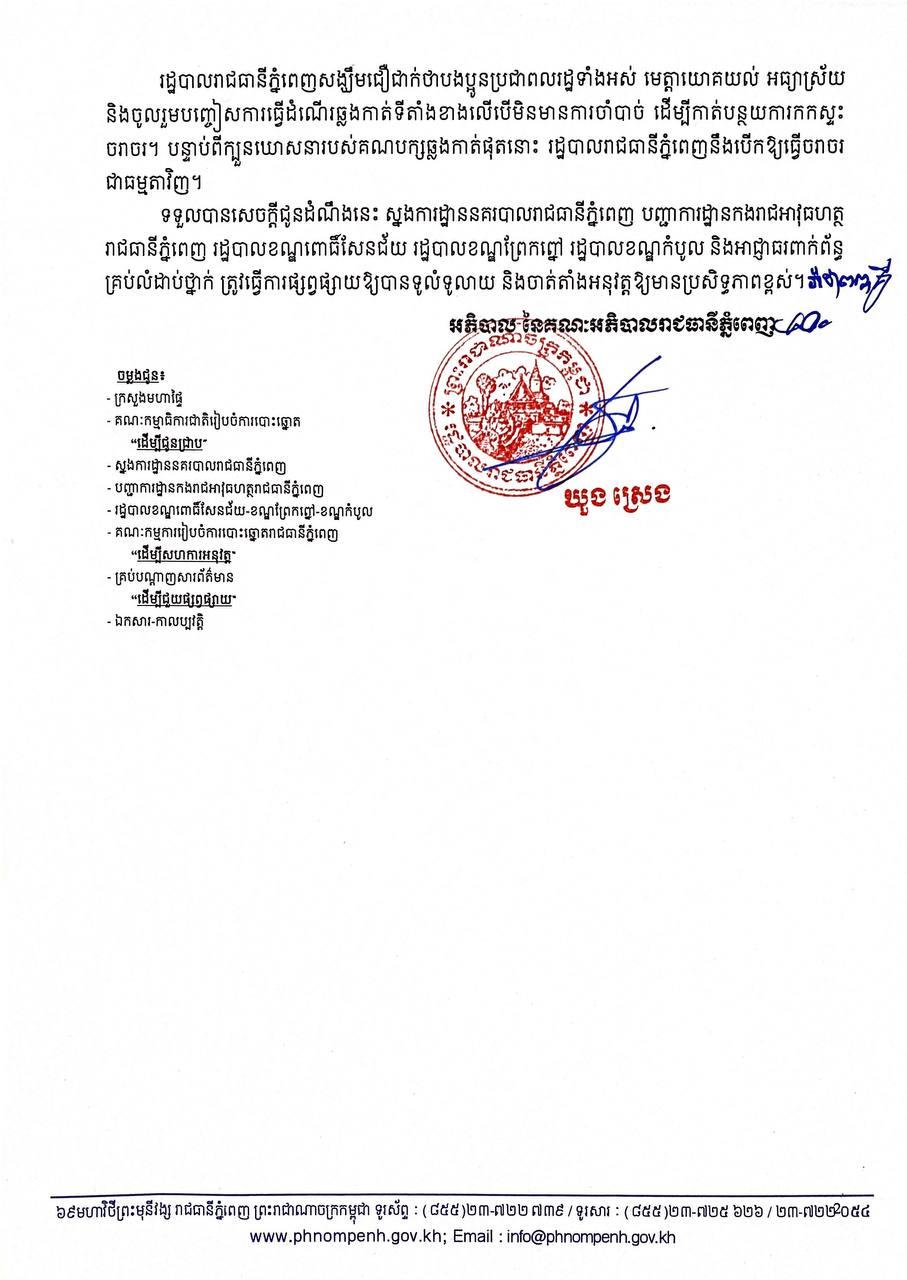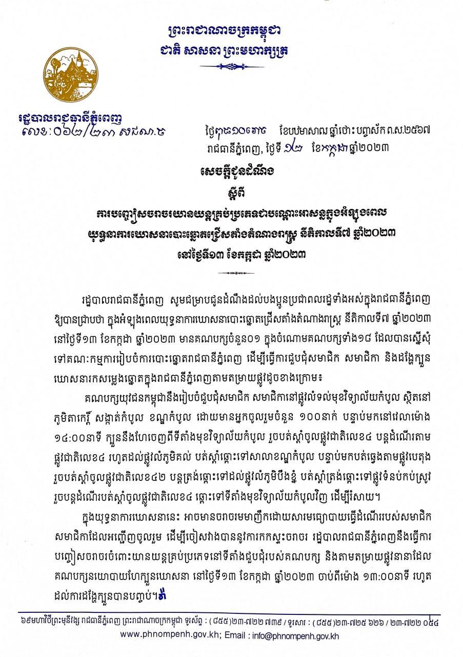 រដ្ឋបាលរាជធានីភ្នំពេញ ជូនដំណឹងពីការបញ្ចៀសចរាចរ យានយន្ដគ្រប់ប្រភេទ ជាបណ្ដោះអាសន្ន ក្នុងអំឡុងពេលយុទ្ធនាការឃោសនាបោះឆ្នោតនៅថ្ងៃស្អែក