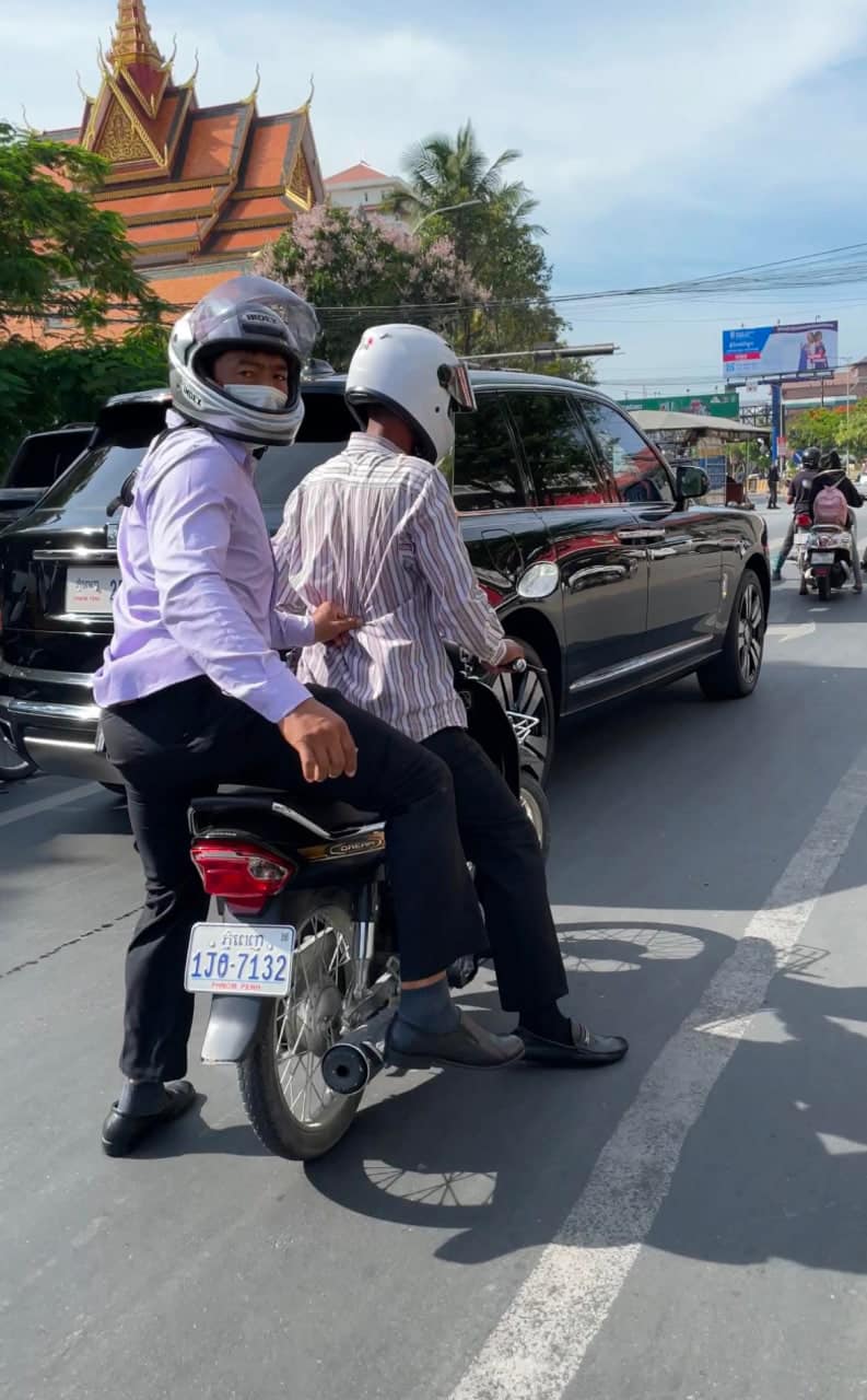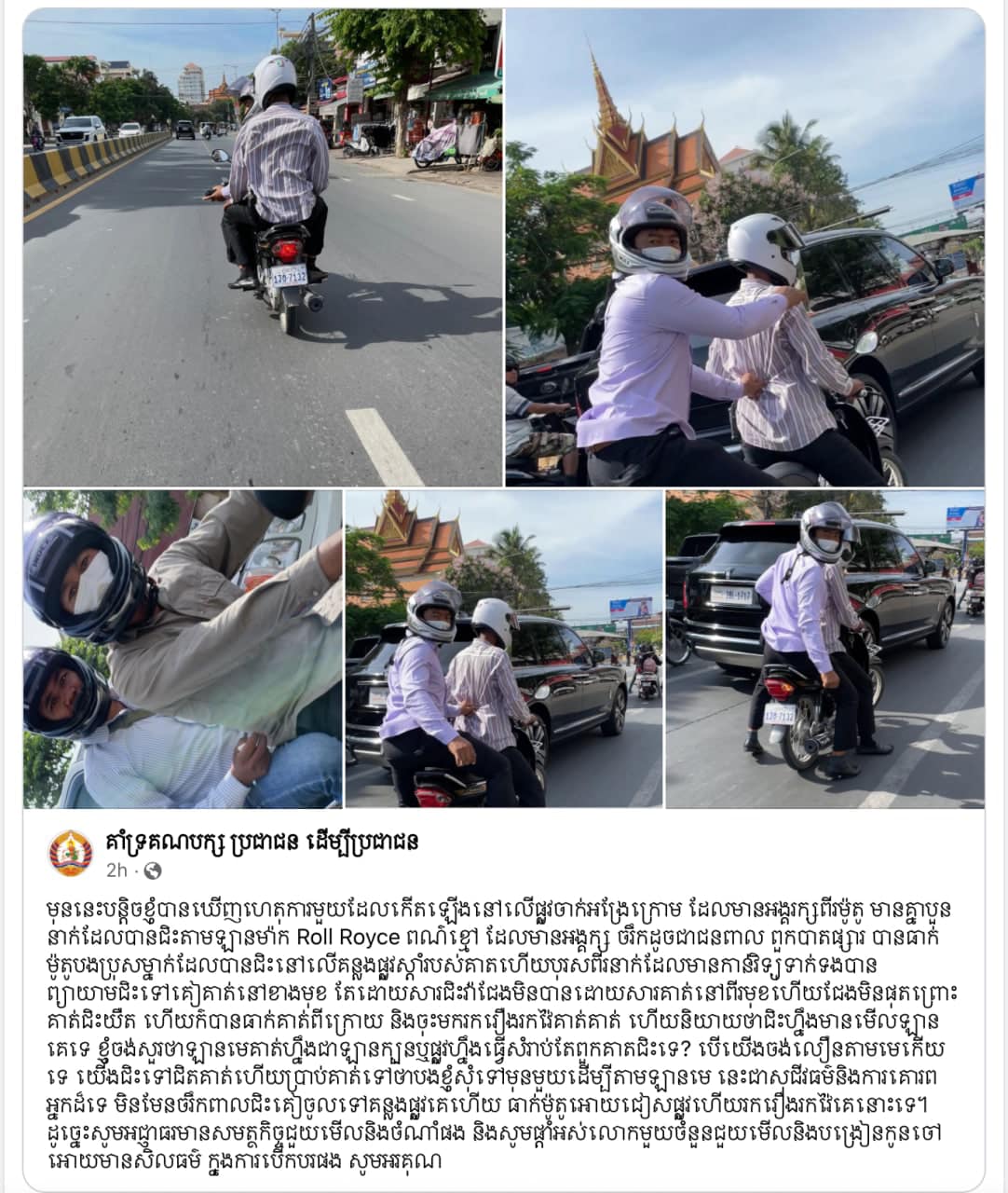 (ភ្នំពេញ)៖ នៅថ្ងៃទី១២ ខែកក្កដា ឆ្នាំ២០២៣ម្សិលមិញ មានការចែកចាយនៅតាមបណ្ដាញសង្គម Facebook នូវហេតុការណ៍មួយដែលបានកើតឡើងរវាងប្រជាពលរដ្ឋ និងបុរស៤នាក់ ជាអង្គរក្សជិះតាមការពារឡានចៅហ្វាយនាយរបស់ខ្លួនម៉ាក Rolls Royce ពណ៌ខ្មៅ ពាក់ផ្លាកលេខភ្នំពេញ2BL-1717 ដោយប៉ះទង្កិចគ្នាដោយពាក្យសម្ដី និងកាយវិការមិនសមរម្យរបស់ក្រុមអង្គរក្សទាំងនោះ។