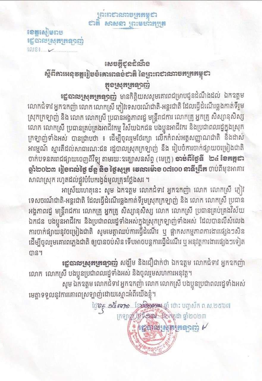 (សៀមរាប)៖ រដ្ឋបាលស្រុកក្រឡាញ់ ខេត្តសៀមរាប នៅថ្ងៃទី១៧ ខែកក្កដា ឆ្នាំ២០២៣ បានចេញសេចក្តីជូនដំណឹងមួយ ដោយស្នើដល់អ្នកឆ្លងកាត់ស្រុកនេះ ចូលរួមគោរពទង់ជាតិ រៀងរាល់ព្រឹកថ្ងៃចន្ទ និងថ្ងៃសុក្រ។ នេះបើតាមសេចក្តីជូនដំណឹង ដែលបណ្តាញ Fresh News ទទួលបាន។