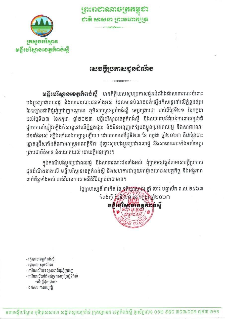 សេចក្ដីជូនដំណឹង បានឲ្យដឹងថា «ចាប់ពីថ្ងៃទី២១ ខែកក្កដា ដល់ថ្ងៃទី២៣ ខែកក្កដា ឆ្នាំ២០២៣ មន្ទីរបរិស្ថានខេត្តកំពង់ស្ពឺ និងសហគមន៍តំបន់ការពារធម្មជាតិ ផ្អាកការនាំភ្ញៀវឡើងកំសាន្តនៅលើភ្នំខ្នងផ្សារ និងមិនអនុញ្ញាតឲ្យបងប្អូនប្រជាពលរដ្ឋ និងសាធារណៈជនទាំងអស់ ឡើងទៅលេងកម្សាន្តឡើយ»។