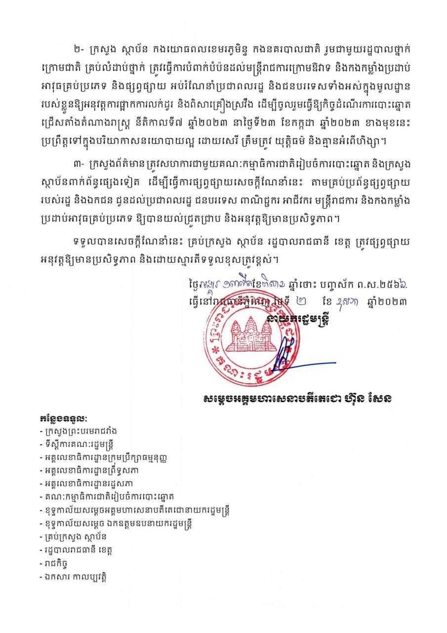 រាជរដ្ឋាភិបាលណែនាំពីការផ្អាកការលក់ដូរ និងពិសាគ្រឿងស្រវឹង មួយថ្ងៃមុនថ្ងៃបោះឆ្នោត និងថ្ងៃបោះឆ្នោតជ្រើសតាំងតំណាងរាស្ត្រ គឺថ្ងៃទី២២ និងថ្ងៃទី២៣ ខែកក្កដា ឆ្នាំ២០២៣