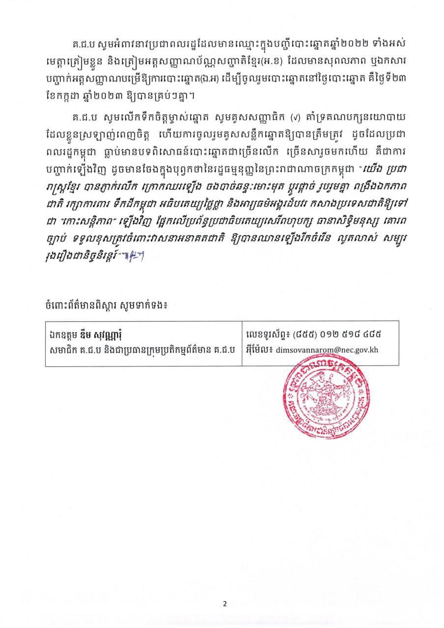 ផ្ទុយទៅវិញ គ.ជ.ប សូមអំពាវនាវ សូមប្រជាពលរដ្ឋ កុំចាញ់បោកទង្វើទុច្ចរិតរបអគតិមួយចំនួន ដែលមានចេតនាបំផ្លាញលទ្ធិប្រជាធិបតេយ្យ បំផ្លាញសិទ្ធិបងប្អូន នឹងនាំបងប្អូនឲ្យប្រព្រឹត្តអំពើផ្ទុយនឹងច្បាប់៕ ផ្ដល់សិទ្ធិដោយ៖ Freshnews