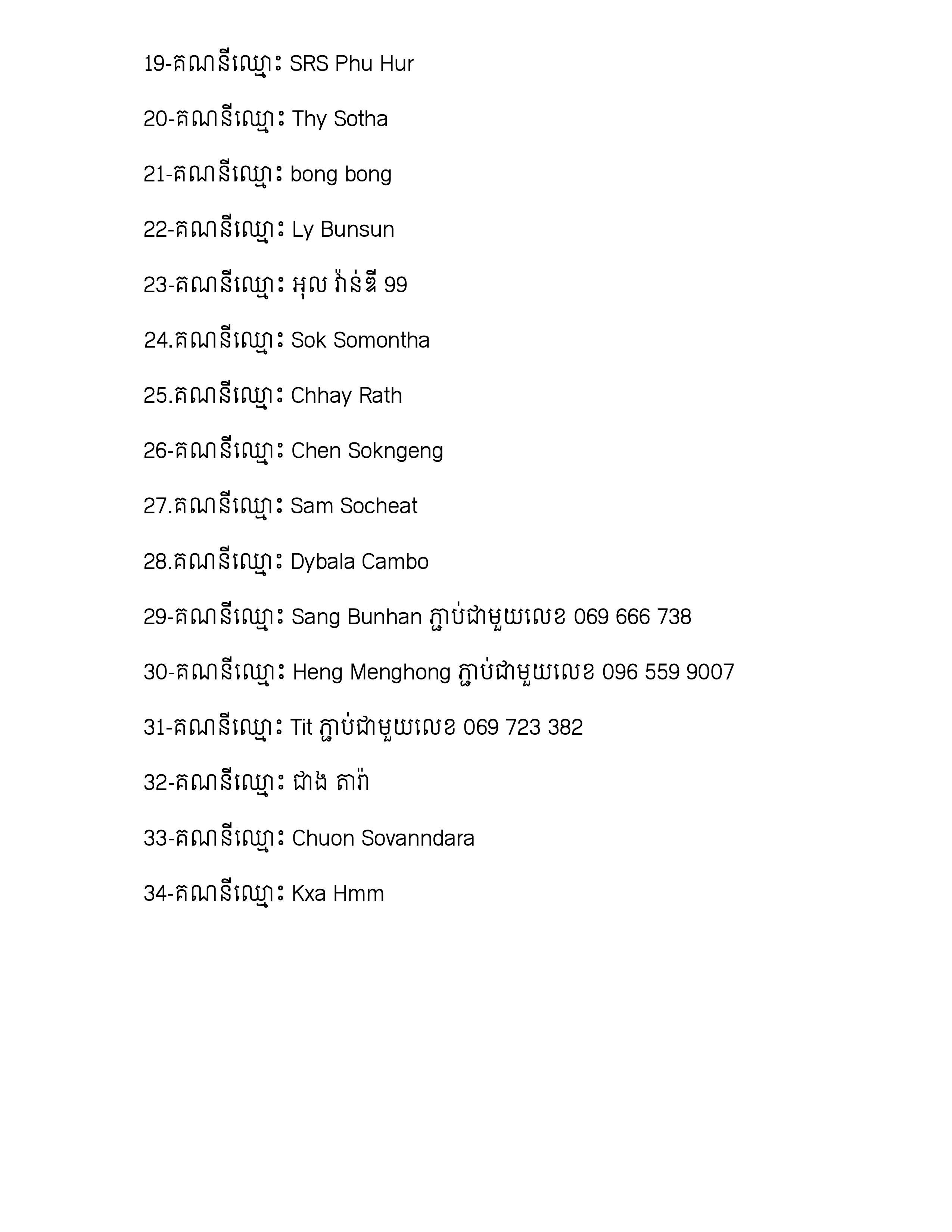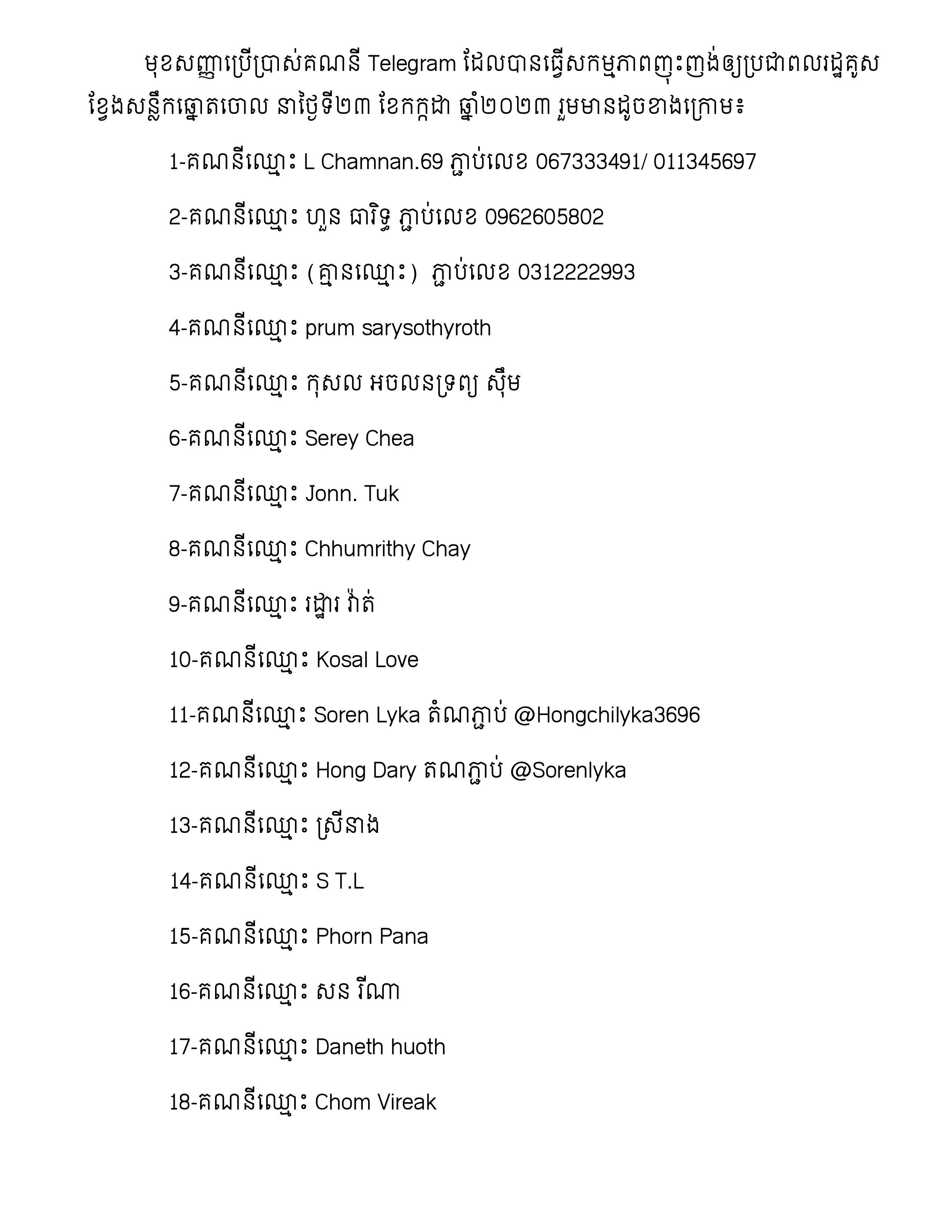 ខាងក្រោមនេះជាបញ្ជីឈ្មោះ សកម្មជនក្រុមប្រឆាំងទាំង៣៤នាក់ ដែលធ្វើសកម្មភាពញុះញង់បំផ្លាញការបោះឆ្នោតជាមួយទណ្ឌិត សម រង្ស៉ី តាមរយៈក្រុមតេលេក្រាម «Sabai សប្បាយ»៖