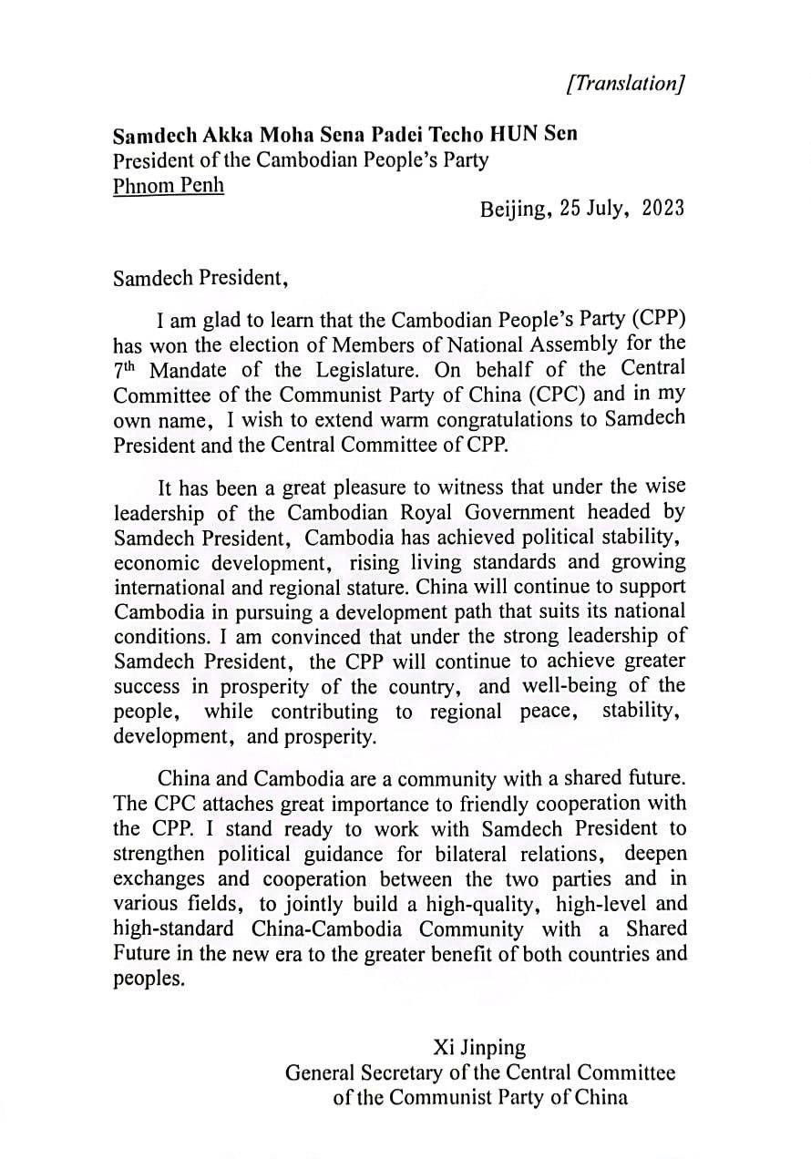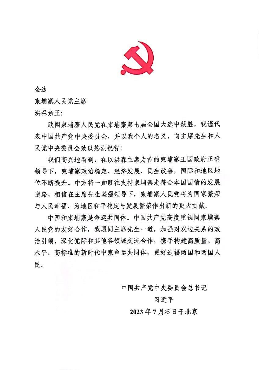 លិខិតអបអរសាទររបស់ប្រធានាធិបតីចិន លោក ស៊ី ជិនពីង ត្រូវបានប្រគល់ជូនសម្តេចតេជោ ហ៊ុន សែន តាមរយៈស្ថានទូតចិនប្រចាំនៅកម្ពុជា នាព្រឹកថ្ងៃទី២៥ ខែកក្កដា ឆ្នាំ២០២៣។