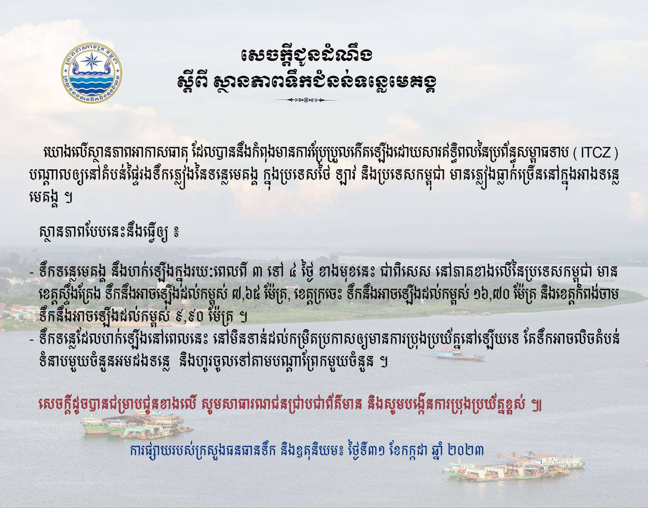 សេចក្ដីជូនដំណឹង បានឲ្យដឹងថា យោងលើស្ថានភាពអាកាសធាតុ ដែលបាននឹងកំពុងមានការប្រែប្រួលកើតឡើង ដោយសារឥទ្ធិពលនៃប្រព័ន្ធសម្ពាធទាប (ITCZ) បណ្តាលឲ្យនៅតំបន់ផ្ទៃរងទឹកភ្លៀង នៃទន្លេមេគង្គ ក្នុងប្រទេសថៃ ឡាវ និងប្រទេសកម្ពុជា មានភ្លៀងធ្លាក់ច្រើន នៅក្នុងអាងទន្លមេគង្គ។ ស្ថានភាពបែបនេះ នឹងធ្វើឲ្យ៖