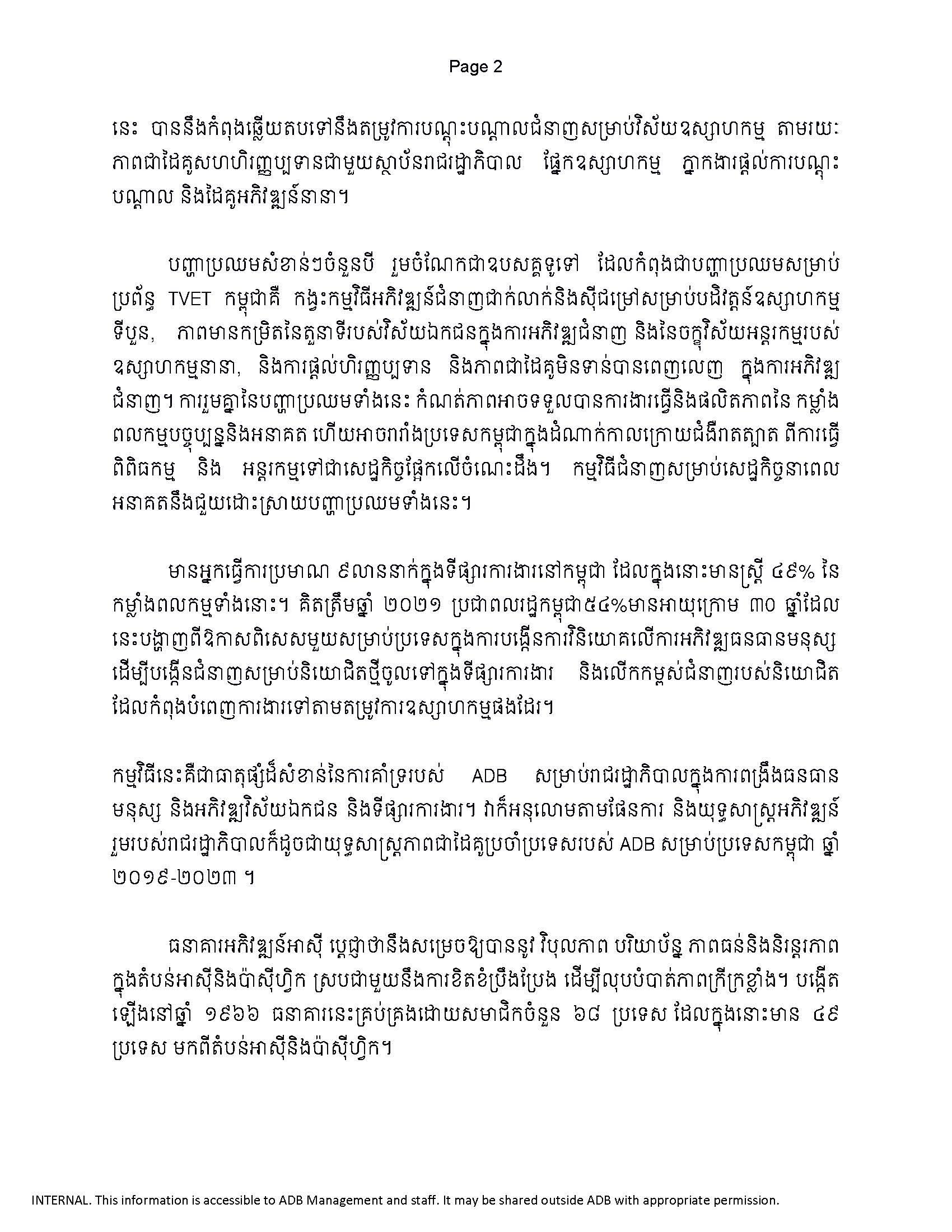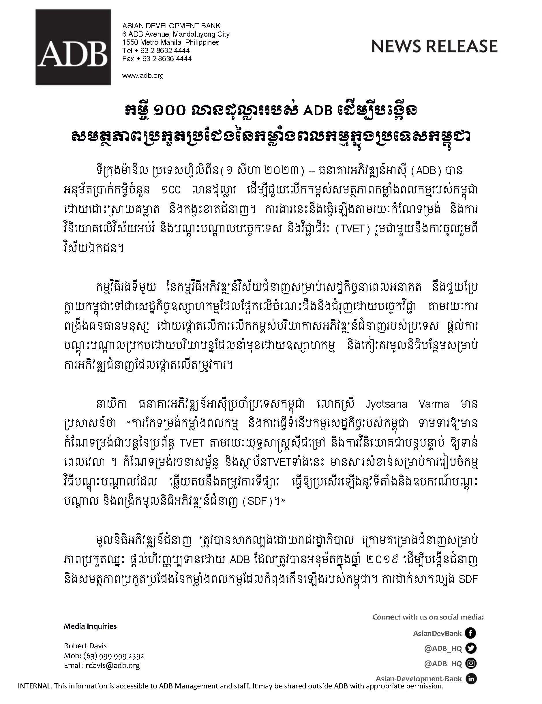 (ភ្នំពេញ)៖ ធនាគារអភិវឌ្ឍន៍អាស៊ី (ADB) បានអនុម័តប្រាក់កម្ចីចំនួន១០០លានដុល្លារ ដើម្បីជួយលើកកម្ពស់សមត្ថភាពកម្លាំងពលកម្មរបស់កម្ពុជា ដោយដោះស្រាយគម្លាត និងកង្វះខាតជំនាញ។ ការងារនេះ នឹងធ្វើឡើងតាមរយៈកំណែទម្រង់ និងការវិនិយោគលើវិស័យអប់រំ និងបណ្តុះបណ្តាលបច្ចេកទេស និងវិជ្ជាជីវៈ (TVET) រួមជាមួយនឹងការចូលរួមពីវិស័យឯកជន។ នេះបើតាមសេចក្ដីប្រកាសព័ត៌មាន ដែលបណ្ដាញព័ត៌មាន Fresh News ទទួលបាននៅថ្ងៃទី០១ ខែសីហា ឆ្នាំ២០២៣។