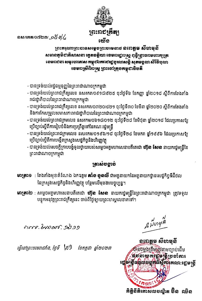 ព្រះមហាក្សត្រ ចេញព្រះរាជក្រឹត្យតែងតាំងលោក តាំង ងួនលី ជាអគ្គនាយកនៃអគ្គនាយកដ្ឋានសេដ្ឋកិច្ចឌីជីថល នៃក្រសួងសេដ្ឋកិច្ច និងហិរញ្ញវត្ថុ
