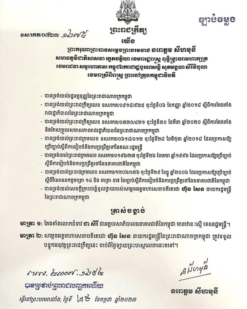 កាលពីថ្ងៃទី២៩ ខែកក្កដា ឆ្នាំ២០២៣ ព្រះករុណា ព្រះបាទសម្តេចព្រះបរមនាថ នរោត្តម សីហមុនី ព្រះមហាក្សត្រ នៃព្រះរាជាណាចក្រកម្ពុជា បានត្រាស់បង្គាប់តែងតាំងលោកស្រីបណ្ឌិត ជា សិរី ជាអគ្គទេសាភិបាលធនាគារជាតិនៃកម្ពុជា។