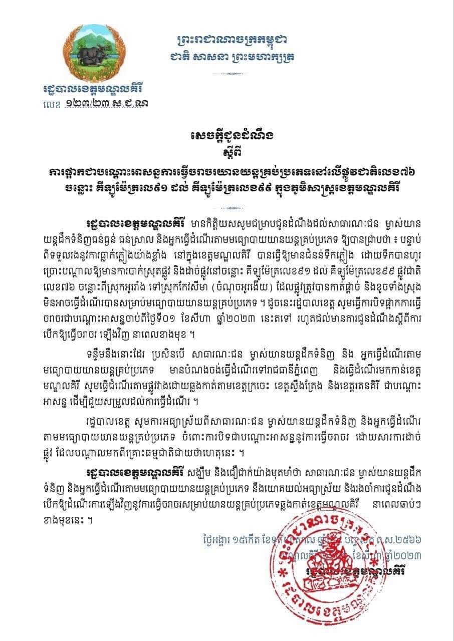 បន្ទាប់ ពីទទួលរងនូវការធ្លាក់ភ្លៀងយ៉ាងខ្លាំង នៅក្នុងខេត្តមណ្ឌលគិរី បានធ្វើឱ្យមានជំនន់ទឹកភ្លៀង ដោយទឹកបានហូរ ច្រោះបណ្តាលឱ្យមានការបាក់ស្រុតផ្លូវ និងដាច់ផ្លូវនៅចន្លោះ គីឡូម៉ែត្រលេខ៩១ ដល់ គីឡូម៉ែត្រលេខ៩៩ ផ្លូវជាតិ លេខ៧៦ ចន្លោះពីស្រុកអូររាំង ទៅស្រុកកែវសីមា (ចំណុចអូរងើយ) ដែលផ្លូវត្រូវបានកាត់ផ្តាច់ និងខូចទាំងស្រុង មិនអាចធ្វើដំណើរបានសម្រាប់មធ្យោបាយយានយន្តគ្រប់ប្រភេទ ។ ដូចនេះរដ្ឋបាលខេត្ត សូមធ្វើការបិទផ្អាកការធ្វើ ចរាចរជាបណ្តោះអាសន្នចាប់ពីថ្ងៃទី០១ ខែសីហា ឆ្នាំ២០២៣ នេះតទៅ រហូតដល់មានការជូនដំណឹងស្តីពីការ បើកឱ្យធ្វើចរាចរ ឡើងវិញ នាពេលខាងមុខ ។