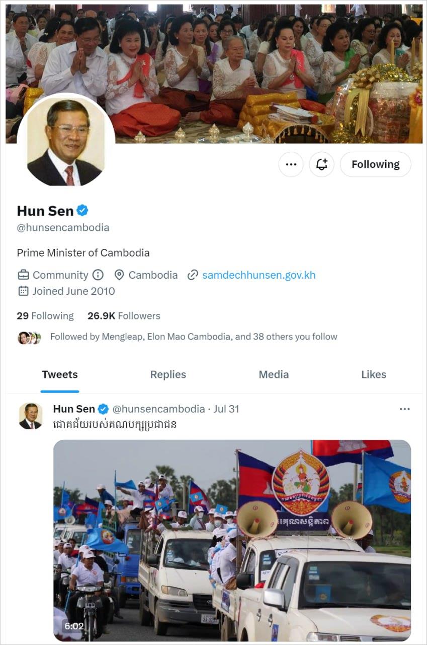 Twitter របស់សម្តេចតេជោ ហ៊ុន សែន គិតត្រឹមថ្ងៃទី០២ សីហា ឆ្នាំ២០២៣នេះ មានចំនួន 26.9K Followers មានឈ្មោះ Hun Sen ជាមួយតំណភ្ជាប់ https://twitter.com/hunsencambodia។ សម្តេចតេជោ ហ៊ុន សែន តែងតែផ្តល់ព័ត៌មាន និងសកម្មភាពផ្សេងៗរបស់សម្តេច ជូនជនរួមជាតិតាមរយៈ Twitter ជាពីរភាសា គឺភាសាខ្មែរ និងភាសាអង់គ្លេស។
