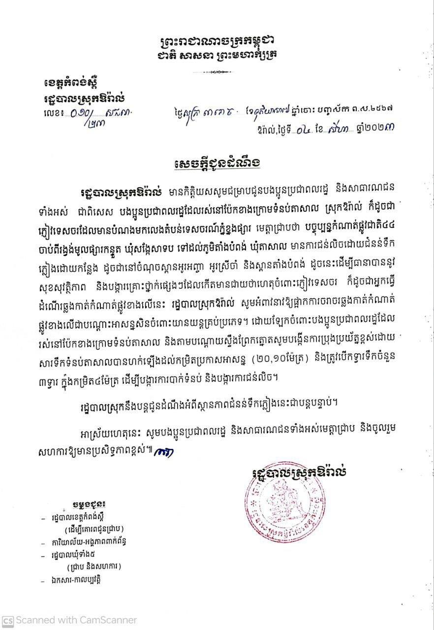 រដ្ឋបាលស្រុកឱរ៉ាល់ ខេត្តកំពង់ស្ពឺ ជូនដំណឹងពីការផ្អាកការចរាចរឆ្លងកាត់កំណាត់ជាតិលេខ៤៤ ចាប់ពីរង្វង់មូលផ្សារកន្ទួត ដល់ភូមិតាំងបំពង់ ជាបណ្ដោះអាសន្នសិន ដោយមានជំនន់ទឹកភ្លៀងហក់ឡើងខ្លាំង