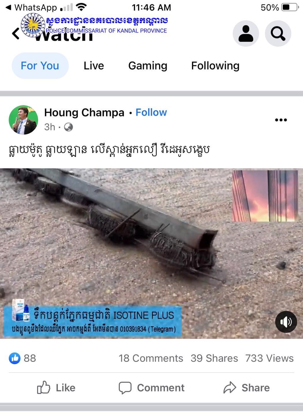 ក្រុមការងារ​ព័ត៌មាន និងប្រតិកម្ម​រហ័ស ​នៃស្នងការដ្ឋាននគរបាលខេត្តកណ្តាល មានកិត្តិយសសូមបំភ្លឺឆ្លេីយតបទៅនិង​គណនីហ្វេសប៊ុកឈ្មោះ Houng Champa បានបង្ហោះវីដេអូមានខ្លឹមសារថា៖ ធ្លាយម៉ូតូ ធ្លាយឡានលើស្ពានអ្នកលឿង វីដេអូសង្ខេបសម្រាប់ឆក់ដែកគោល វីស ដែកកាំកង់លើស្ពានអ្នកលឿង។