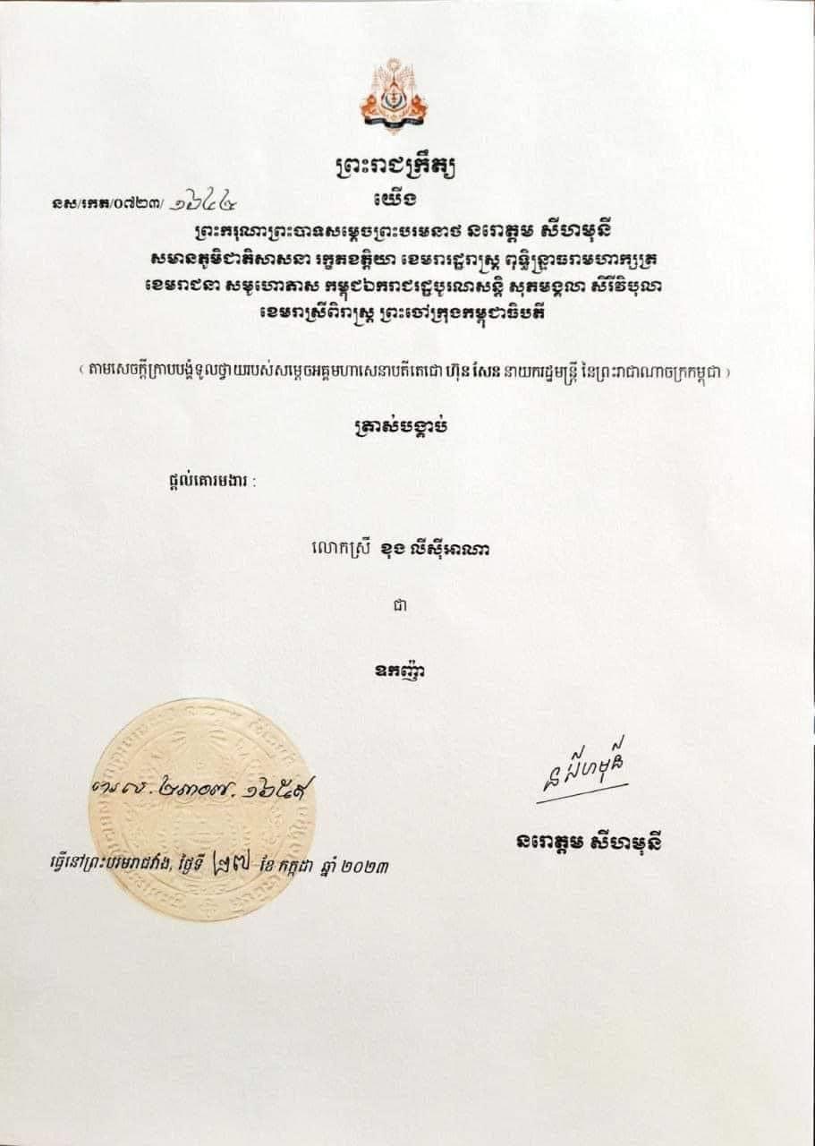 ព្រះមហាក្សត្រចេញព្រះរាជក្រឹត្យផ្ដល់គោរមងារដល់លោកស្រី ខុង លីស៊ីអាណា ជាឧកញ៉ា