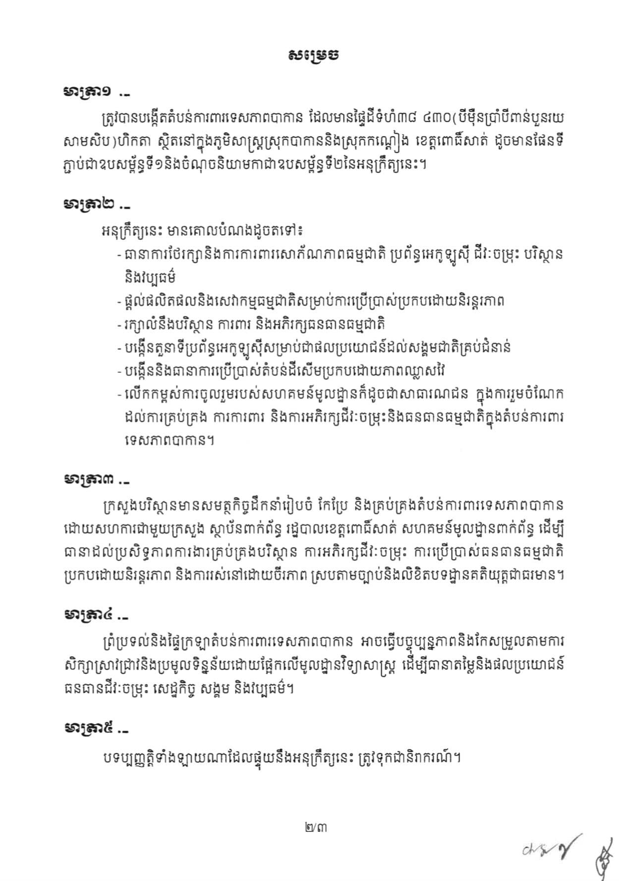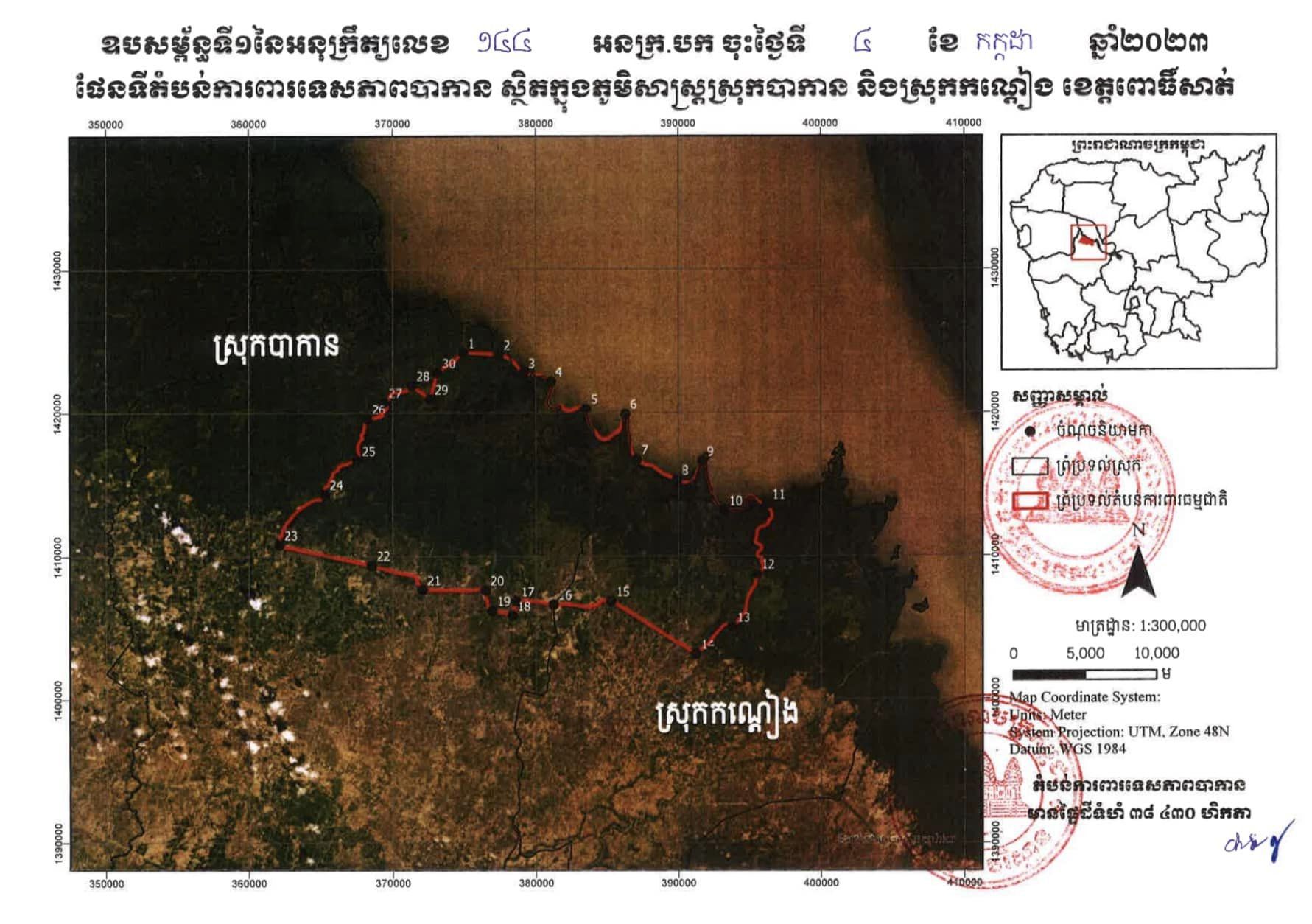 (ពោធិ៍សាត់)៖ កាលពីថ្ងៃទី៥ ខែសីហា ឆ្នាំ២០២៣ ខាងមន្ទីរបរិស្ថានខេត្តពោធិ៍សាត់ បានបង្ហោះអំពី អនុក្រឹត្យ ១៤៤ អនក្រ.បក ស្តីពីការបង្កើតតំបន់ការពារទេសភាពបាកាន ដែលមានផ្ទៃដីទំហំ៣៨ ៤៣០(បីម៉ឺនប្រាំបីពាន់បួនរយសាមសិប)ហិចតា ស្ថិតនៅក្នុងភូមិសាស្ដ្រស្រុកបាកាននិងស្រុកកណ្ដៀង ខេត្តពោធិ៍សាត់។
