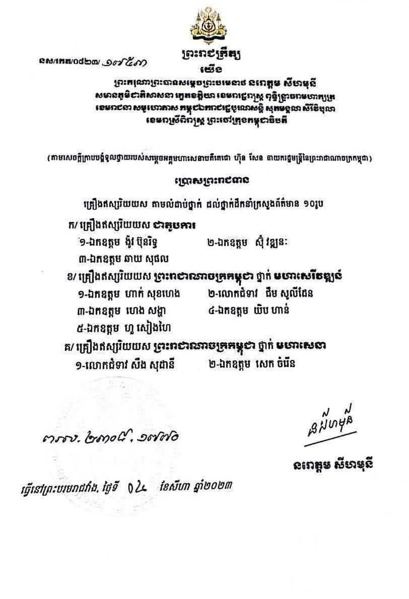 យោងតាមព្រះរាជក្រឹត្យត្រាស់បង្គាប់ប្រោសព្រះរាជទានគ្រឿងឥស្សរិយយសបានបង្ហាញថា មន្ត្រី ៣រូប ទទួលបានគ្តឿងឥស្សរិយយស «ជាតូបការ», ៥រូប ទទួលបានគ្រឿងឥស្សរិយយសព្រះរាជាណាចក្រកម្ពុជា ថ្នាក់មហាសេរីវឌ្ឍន៍ និង២រូបទៀត ទទួលបានគ្រឿងឥស្សរិយយសព្រះរាជាណាចក្រកម្ពុជា ថ្នាក់មហាសេនា៕ ផ្ដល់សិទ្ធិដោយ៖ Freshnews