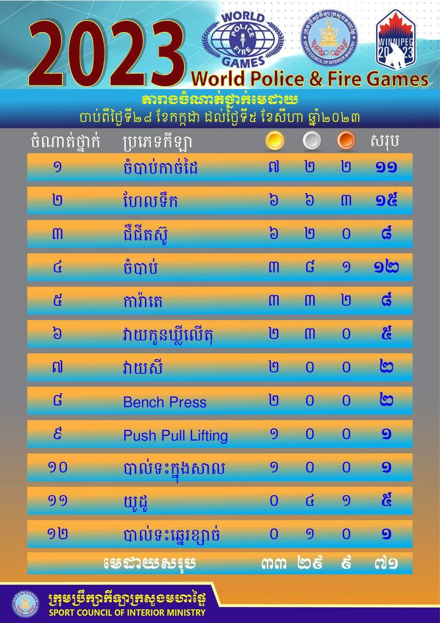 (ភ្នំពេញ)៖ ក្រុមកីឡានគរបាលជាតិកម្ពុជា បានបញ្ចប់ការប្រកួតក្នុងព្រឹត្តិការណ៍កីឡានគរបាល និងកងពន្លត់អគ្គិភ័យពិភពលោក លើកទី២០ ឆ្នាំ២០២៣ (The 20th World Police & Fire Games 2023) នៅប្រទេសកាណាដាហើយនាល្ងាចថ្ងៃទី០៦ ខែសីហាម្សិលមិញ ដោយដណ្ដើមបានមេដាយសរុប ៧១គ្រឿង ក្នុងនោះមានមេដាយមាស ៣៣ ប្រាក់ ២៩ និងសំរឹទ្ធ ៩គ្រឿង។