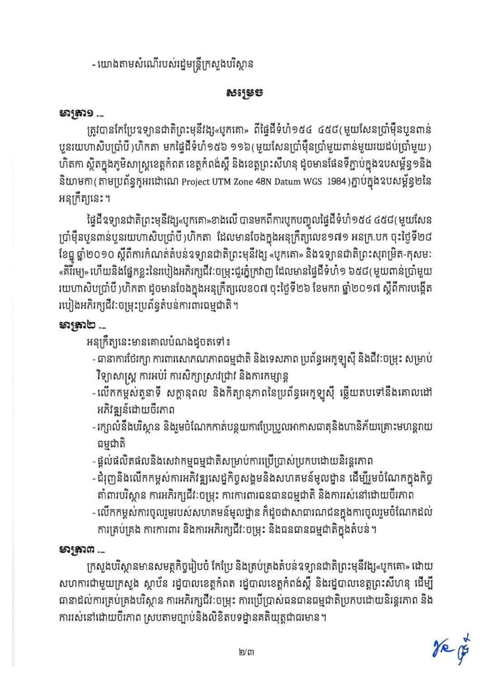 រាជរដ្ឋាភិបាល ចេញអនុក្រឹត្យកែប្រែឧទ្យានជាតិព្រះមុនីវង្សបូកគោ ដោយពង្រីកទំហំផ្ទៃដីដល់ជាង ១៥៦ពាន់ហិកតា ស្ថិតក្នុងភូមិសាស្ត្រខេត្តកំពត ខេត្តកំពង់ស្ពឺ និងខេត្តព្រះសីហនុ