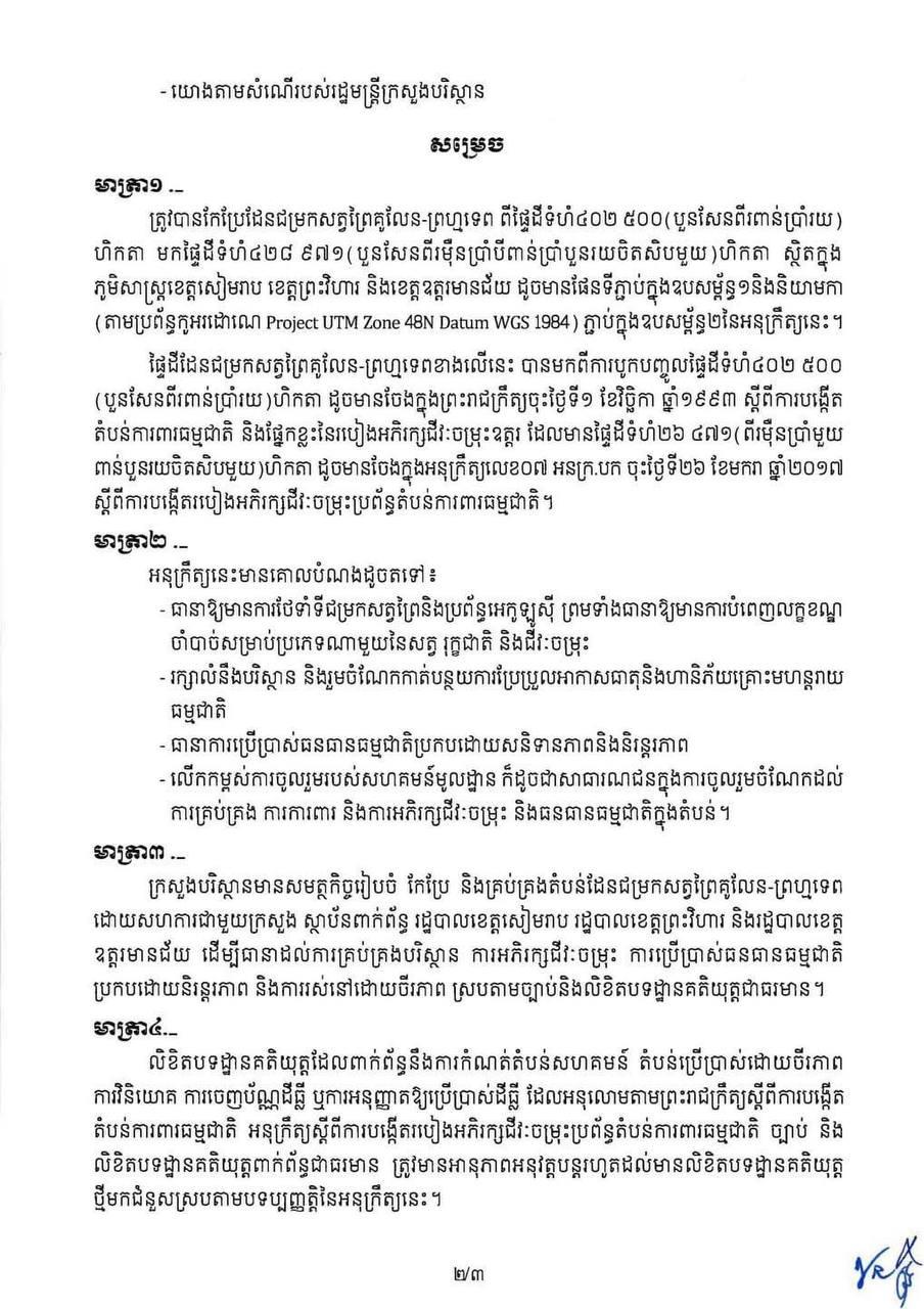 រាជរដ្ឋាភិបាល ចេញអនុក្រឹត្យ ស្ដីពី ការកែប្រែដែនជម្រកសត្វព្រៃគូលែន-ព្រហ្មទេព