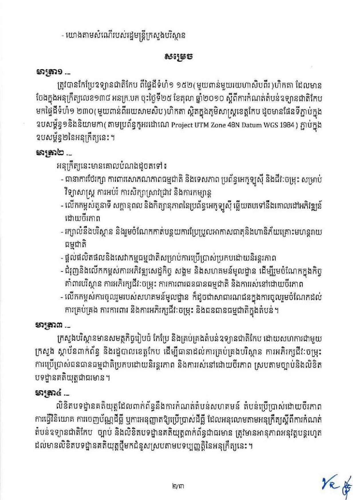 បើតាមអនុក្រឹត្យ, ឧទ្យានជាតិ «កែប» ត្រូវបានកែប្រែពីផ្ទៃដីទំហំ១,១៥២ហិកតា មកផ្ទៃដីទំហំ១,២៣០ហិតកាស្ថិតក្នុងភូមិសាស្ត្រខេត្តកែប៕