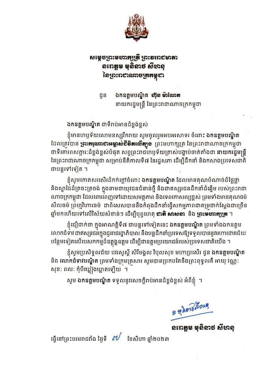 (ភ្នំពេញ)៖ សម្តេចព្រះមហាក្សត្រី ព្រះវររាជមាតា នរោត្តម មុនិនាថ សីហនុ បានផ្ញើព្រះរាជសារលិខិតអបអរសាទរ ជូនចំពោះឯកឧត្តមបណ្ឌិត ហ៊ុន ម៉ាណែត ដែលត្រូវបានព្រះមហាក្សត្រ ត្រាស់បង្គាប់ចាត់តាំងជា នាយករដ្ឋមន្ត្រីនៃកម្ពុជា សម្រាប់នីតិកាលទី៧ នៃរដ្ឋសភា។ នេះបើតាមសារលិខិតដែលបណ្តាញព័ត៌មាន Fresh News ទទួលបាននៅថ្ងៃទី៨ ខែសីហានេះ។