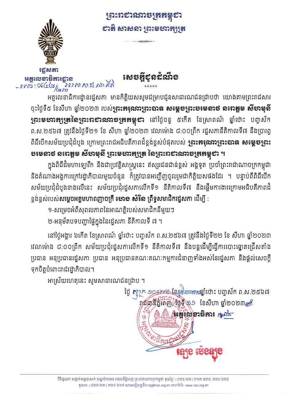 (ភ្នំពេញ)៖ រដ្ឋសភា នីតិកាលទី៧ នឹងប្រារព្ធពិធីបើកសម័យប្រជុំដំបូង ក្រោមព្រះរាជអធិបតីភាពដ៏ខ្ពង់ខ្ពស់បំផុតរបស់ ព្រះករុណា ព្រះបាទសម្តេចព្រះ បរមនាថ នរោត្តម សីហមុនី ព្រះមហាក្សត្រ នៃព្រះរាជាណាចក្រកម្ពុជា នៅថ្ងៃចន្ទ ទី២១ ខែសីហា ឆ្នាំ២០២៣ វេលាម៉ោង ៨៖០០ព្រឹក។
