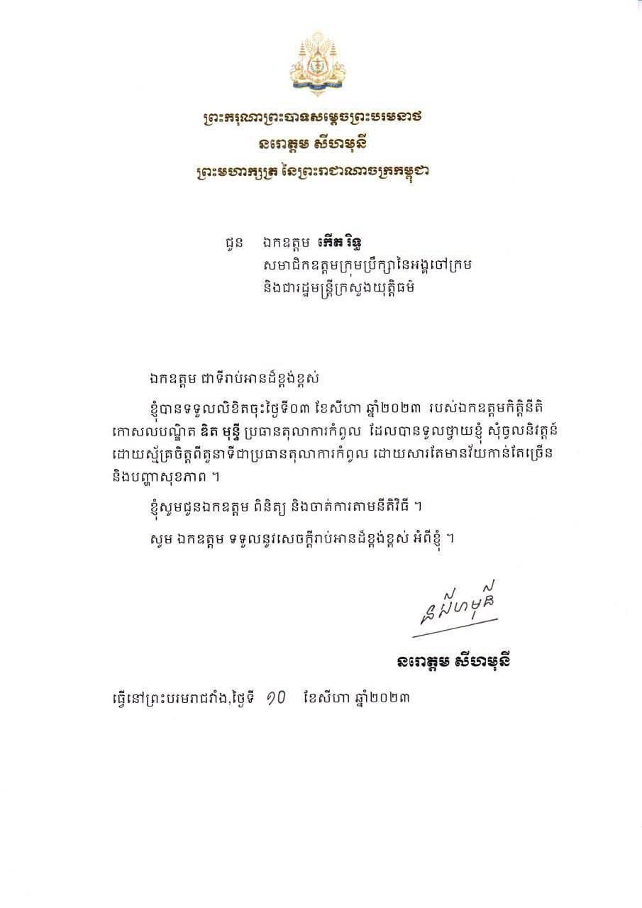 ព្រះមហាក្សត្រ ចេញព្រះរាជក្រឹត្យដាក់ឲ្យលោក ឌិត មុន្ទី ប្រធានតុលាការកំពូលចូលនិវត្តន៍ ជាមួយចៅក្រមតុលាការកំពូល២រូបទៀត ចាប់ពីថ្ងៃទី១៥ ខែសីហា