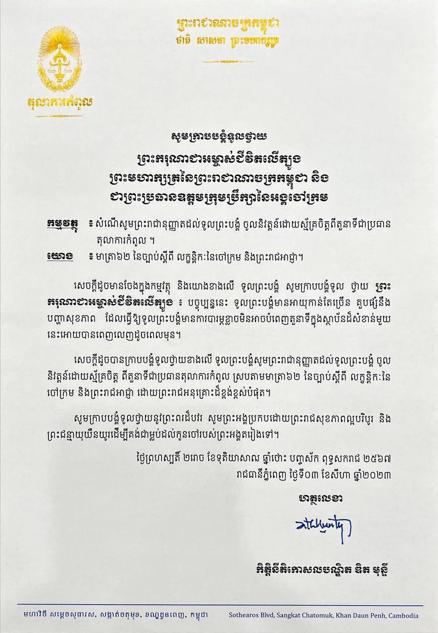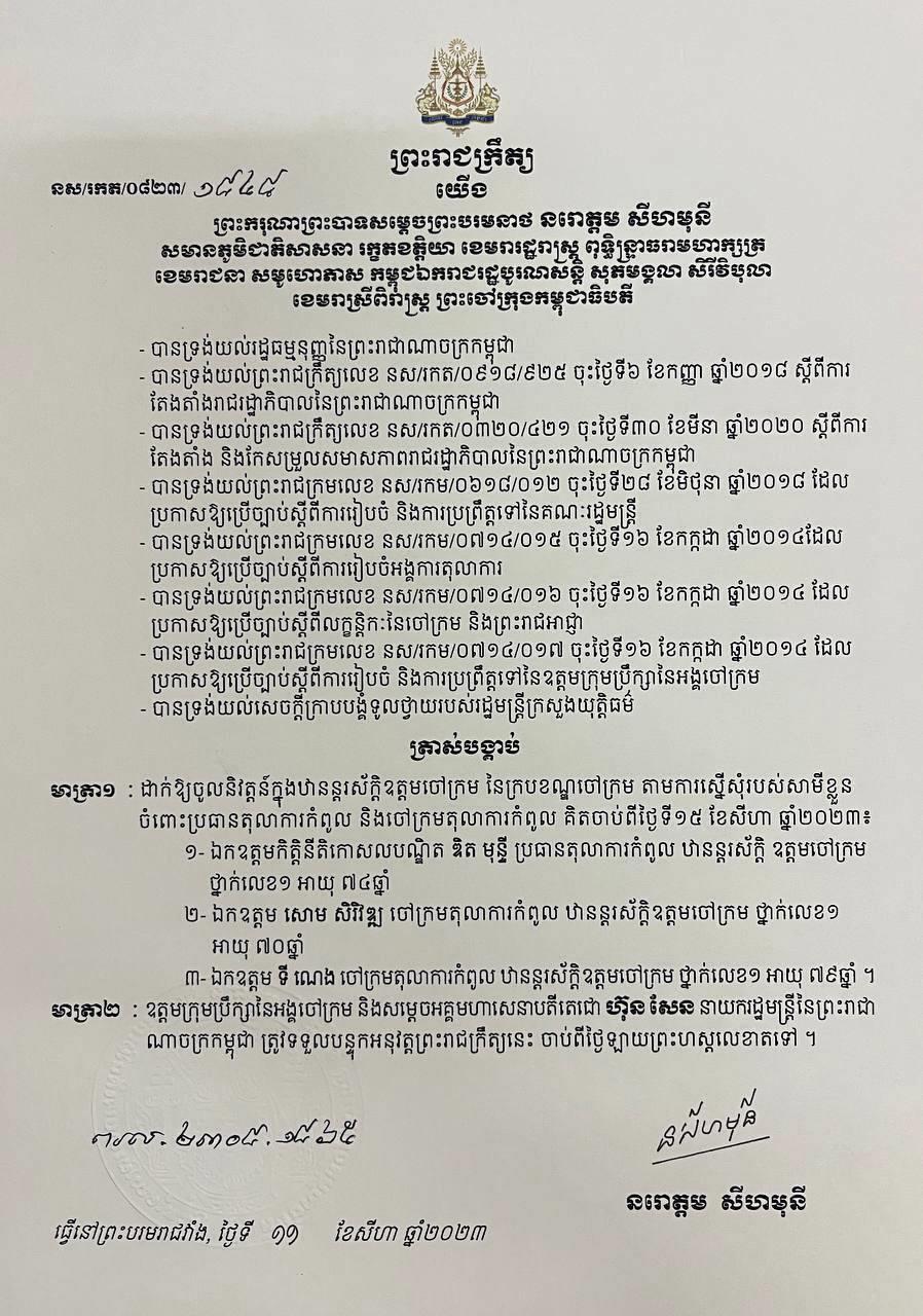 «មាត្រា១ ដាក់ឱ្យចូលនិវត្តន៍ក្នុងឋានន្តរស័ក្តិឧត្តមចៅក្រម នៃក្របខណ្ឌចៅក្រម តាមការស្នើសុំរបស់សាមីខ្លួន ចំពោះប្រធានតុលាការកំពូល និងចៅក្រមតុលាការកំពូល គិតចាប់ពីថ្ងៃទី១៥ ខែសីហា ឆ្នាំ២០២៣៖