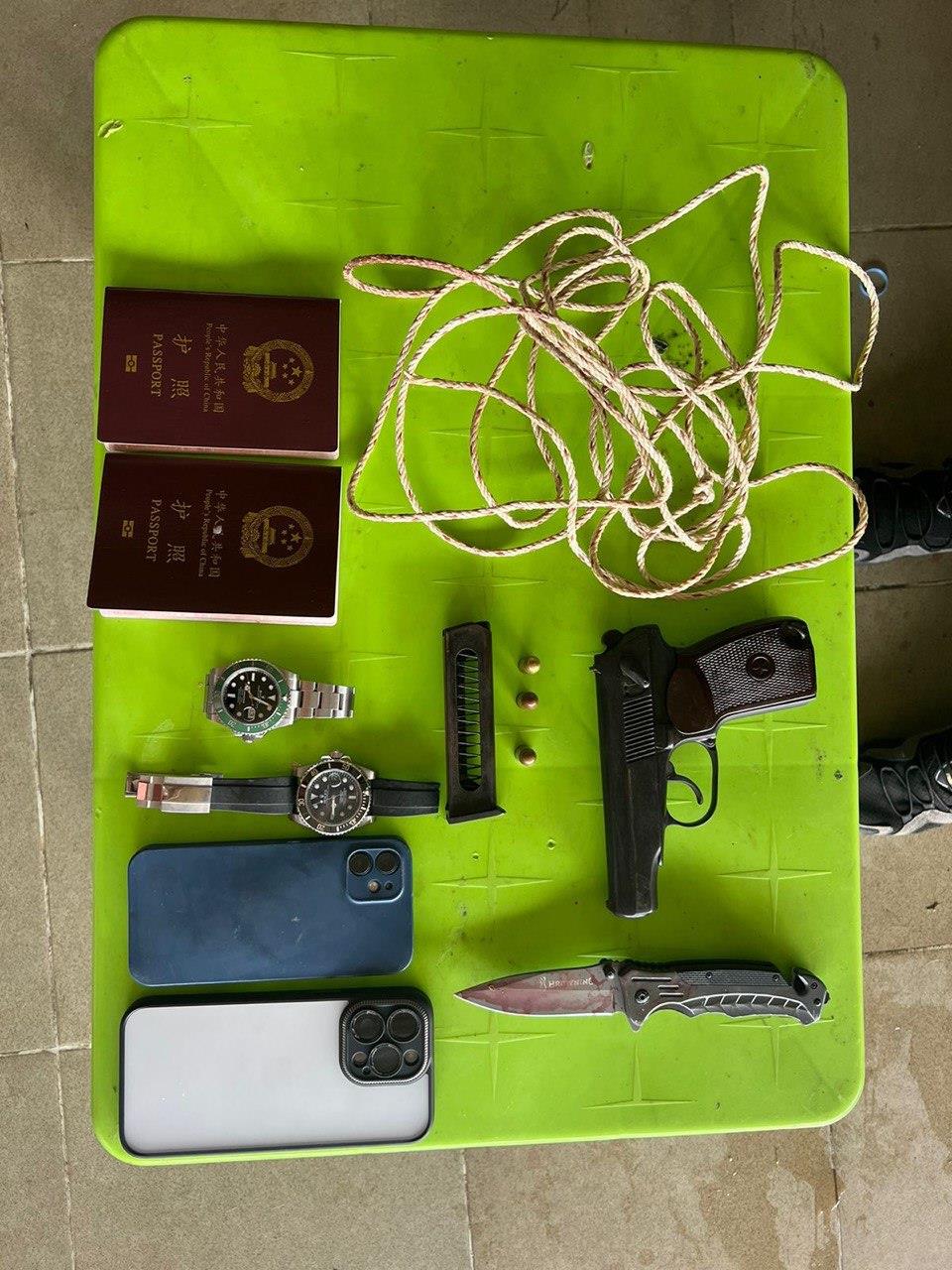 សម្ភារវត្ថុតាងចាប់យកបាន៖ -រថយន្ត ១គ្រឿង ម៉ាក Mercedes C300 ពណ៌ស ពាក់ស្លាកលេខ កម្ពុជា KLK.9898 ។ (ជាមធ្យោបាយជិះធ្វើសកម្មភាព), -អាវុធខ្លី ១ដើម ម៉ាក K59 ពណ៌ខ្មៅ លេខសម្គាល់គ្មាន (បង់ ១ មាន ៣គ្រាប់), (អាវុធធ្វើសកម្មភាពភ្ជុងជនរងគ្រោះ), -កូនកាំបិតចុងស្រួច ០១ដើម (មានប្រឡាក់ឈាមរបស់ជនរងគ្រោះ), -ទូរស័ព្ទដៃ ២គ្រឿង, -លិខិតឆ្លងដែន ២ក្បាល, -កាតរឹង ២សន្លឹក, -កាបូបក្រវាត់ចង្កេះ ១, -នាឡិកាដៃ ២គ្រឿង, -ខ្សែ ១ខ្សែ។