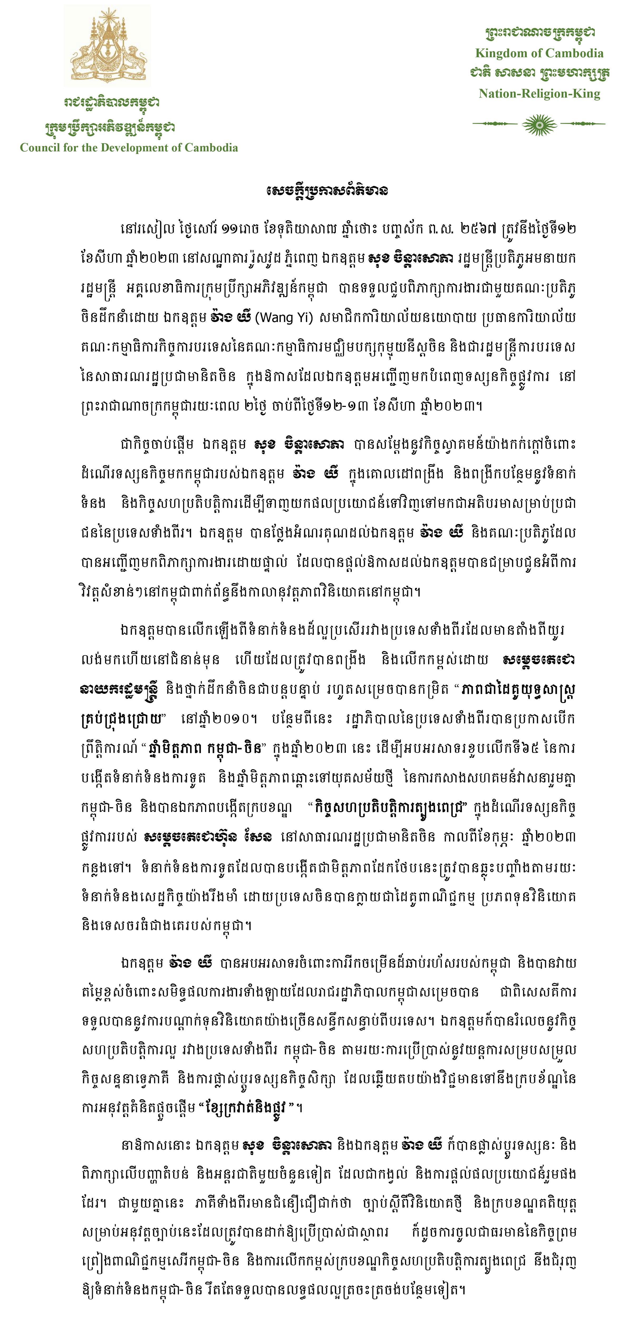 ការលើកឡើងរបស់លោក សុខ ចិន្តាសោភា ធ្វើឡើងក្នុងជួបពិភាក្សាការងារជាមួយគណៈប្រតិភូចិន ដឹកនាំដោយលោក វ៉ាង យី (Wang Yi) សមាជិកការិយាល័យនយោបាយ ប្រធានការិយាល័យគណៈកម្មាធិការកិច្ចការបរទេស នៃគណៈកម្មាធិការមជ្ឈិមបក្សកុម្មុយនីស្តចិន និងជារដ្ឋមន្ត្រីការបរទេស នៃសាធារណរដ្ឋប្រជាមានិតចិន នៅរសៀលថ្ងៃទី១២ ខែសីហា ឆ្នាំ២០២៣ នៅសណ្ឋាគារ រ៉ូសវូដ ភ្នំពេញ។