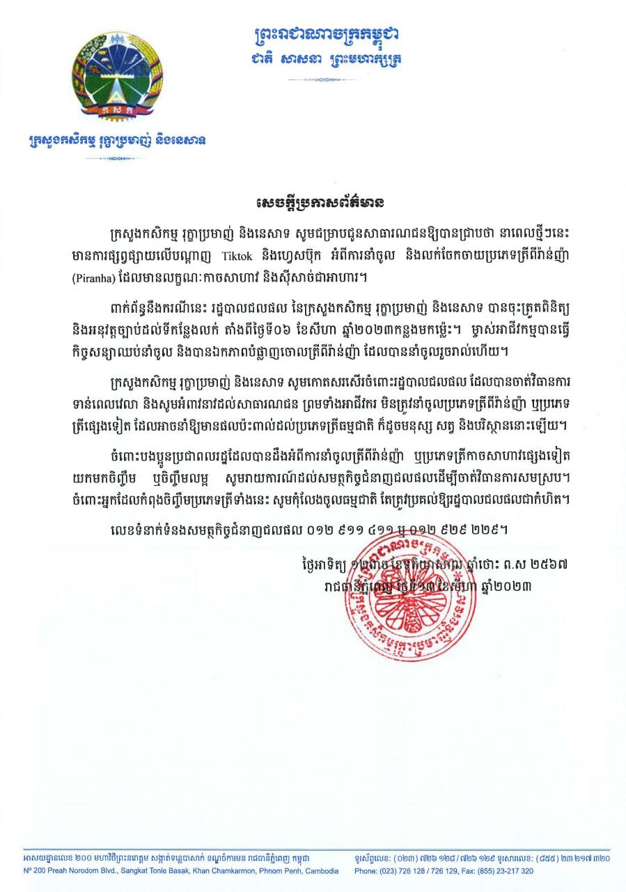 ក្រសួងកសិកម្ម បានឲ្យដឹងថា នាពេលថ្មីៗនេះមានការផ្សព្វផ្សាយលើបណ្តាញ Tiktok និងហ្វេសប៊ុក អំពីការនាំចូល និងលក់ចែកចាយប្រភេទត្រីពីរ៉ាន់ញ៉ា (Piranha) ដែលមានលក្ខណៈកាចសាហាវ និងស៊ីសាច់ជាអាហារ។