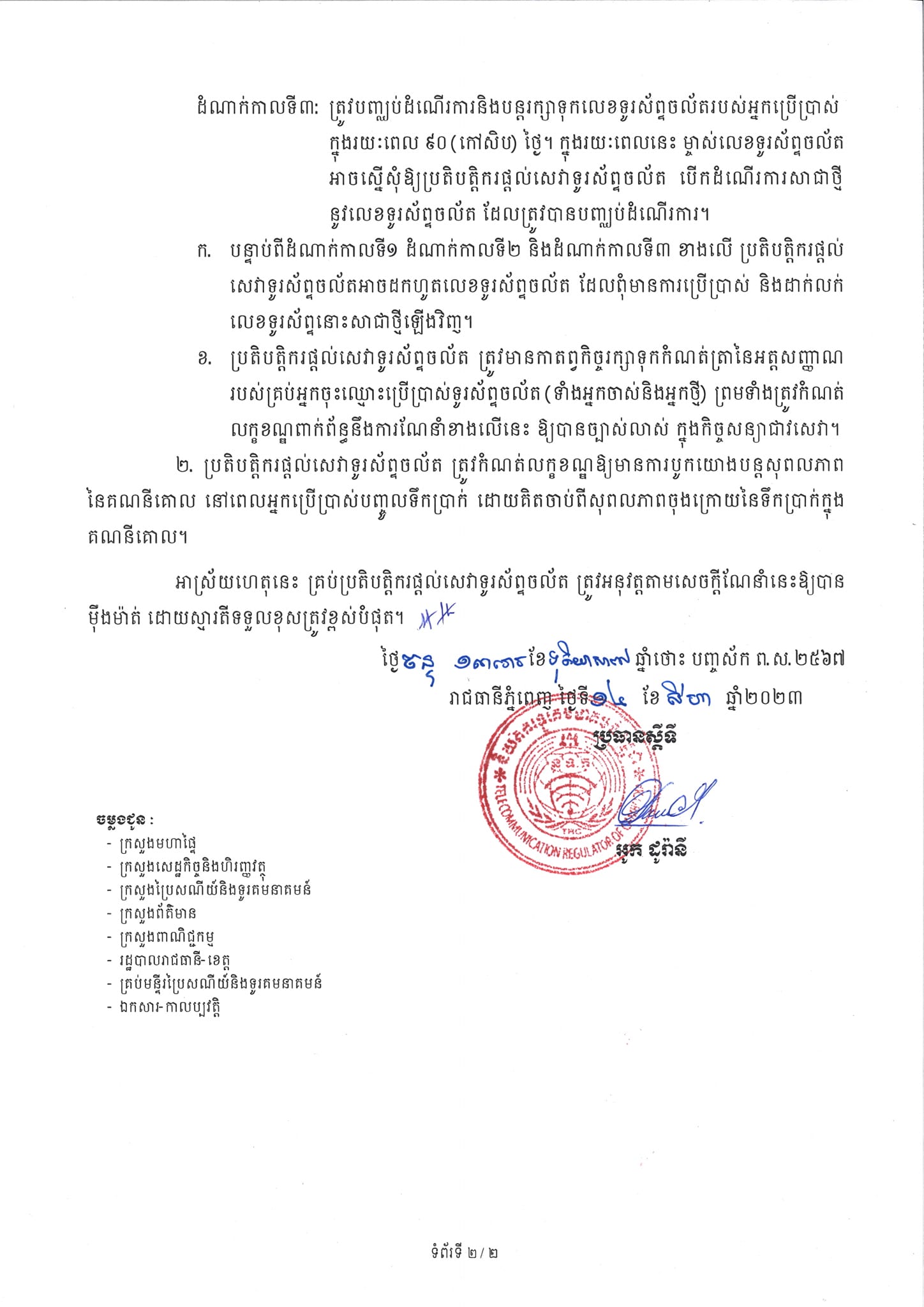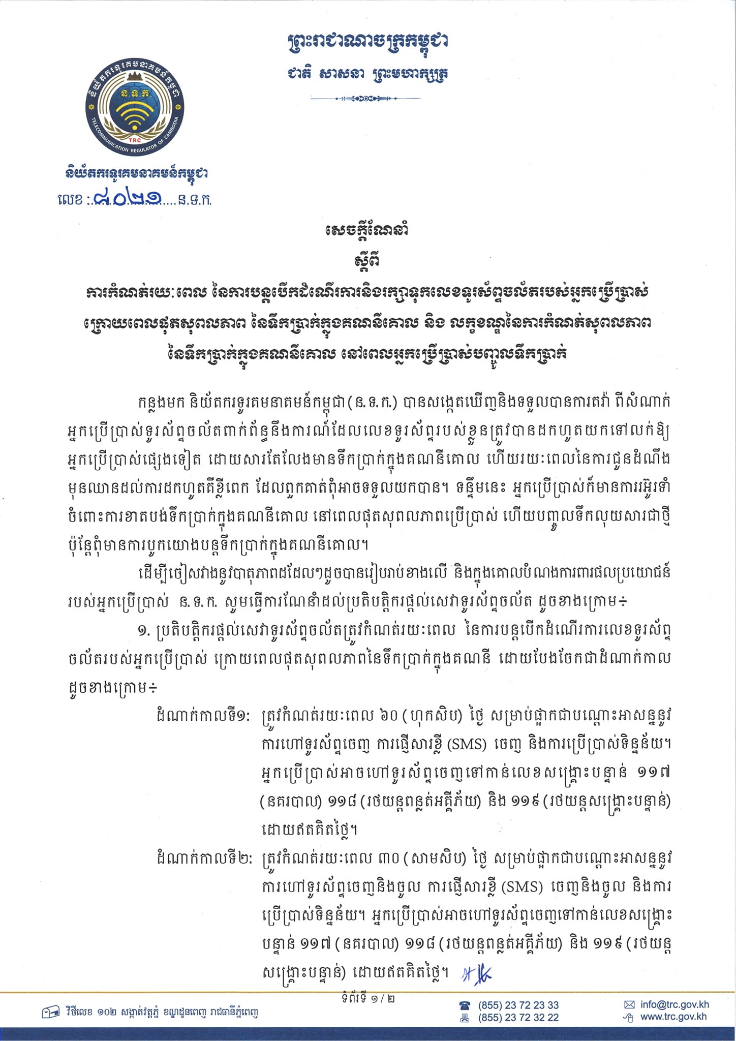 ខាងក្រោមនេះ ជាសេចក្ដីណែនាំ របស់និយ័តករទូរគមនាគមន៍កម្ពុជា ដែលមានខ្លឹមសារទាំងស្រុង៖