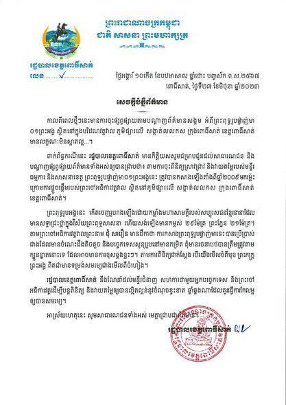 ជាមួយគ្នានោះ រដ្ឋបាលខេត្តពោធិ៍សាត់ បានប្រកាសថា នឹង ណែនាំដល់ មន្ទីរជំនាញ សហការ ជាមួយអ្នកបច្ចេកទេស និងព្រះចៅអធិការវត្ត ដើម្បីបន្តពិនិត្យ និងវាយតម្លៃ ឱ្យបានល្អិតល្អន់នូវចំណុចខ្វះខាត ឆ្គាំឆ្គងណា ដែលគួរធ្វើការកែលម្អឱ្យបានសមរម្យ៕ ផ្តល់សិទ្ធិដោយ៖ freshnews