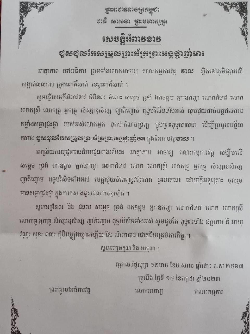(ពោធិ៍សាត់)៖ ចៅអធិការ ព្រមទាំងលោកអាចារ្យ គណៈកម្មការ វត្តវាល ស្ថិតនៅភូមិផ្សារលើ សង្កាត់លលកស ក្រុងពោធិ៍សាត់ ខេត្តពោធិ៍សាត់ បានអំពាវនា ដល់ញាតិញោមពុទ្ធបរិស័ទ ព្រមទាំងសប្បុរសជនទាំងអស់ សូមជួយចាប់មគ្គផលតាមកម្លាំងសទ្ធាជ្រះថ្លា ដើម្បីប្រមូលបច្ច័យ កសាង ជួសជុល និងកែសម្រួលព្រះភ័ក្ត្រព្រះអង្គផ្ចាញ់មារ ក្នុងទីអារាមវត្តវាល ក្រោយមានការរិះគន់។