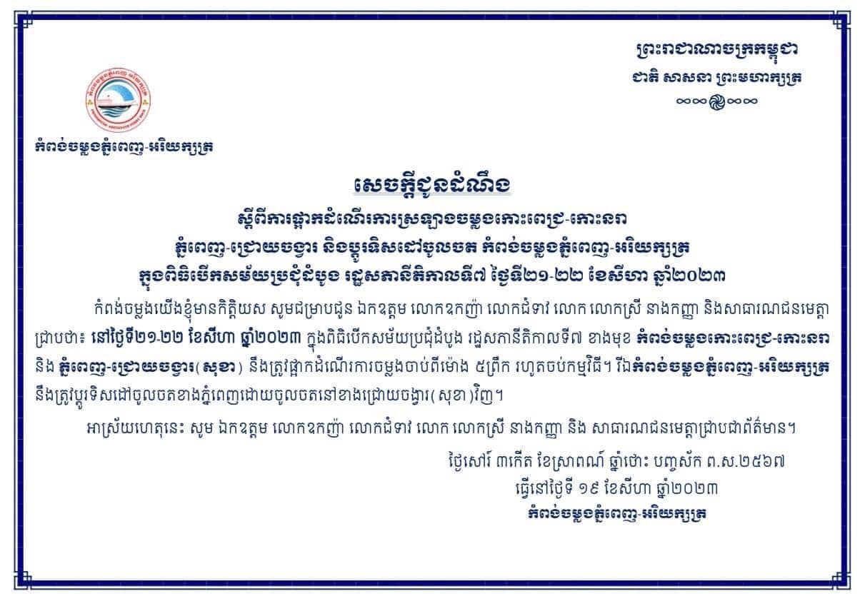 កំពង់ចម្លងភ្នំពេញ-អរិយក្សត្រ ជូនដំណឹងផ្អាកដំណើរការស្រឡាងចម្លងកោះពេជ្រ-កោះនរា ភ្នំពេញ-ជ្រោយចង្វារ និងប្ដូរទិសដៅចូលចត កំពង់ចម្លងភ្នំពេញ-អរិយក្សត្រ ក្នុងពិធីបើកសម័យប្រជុំដំបូងរដ្ឋសភានីតិកាលទី៧ ថ្ងៃទី២១-២២ ខែសីហា ឆ្នាំ២០២៣នេះ