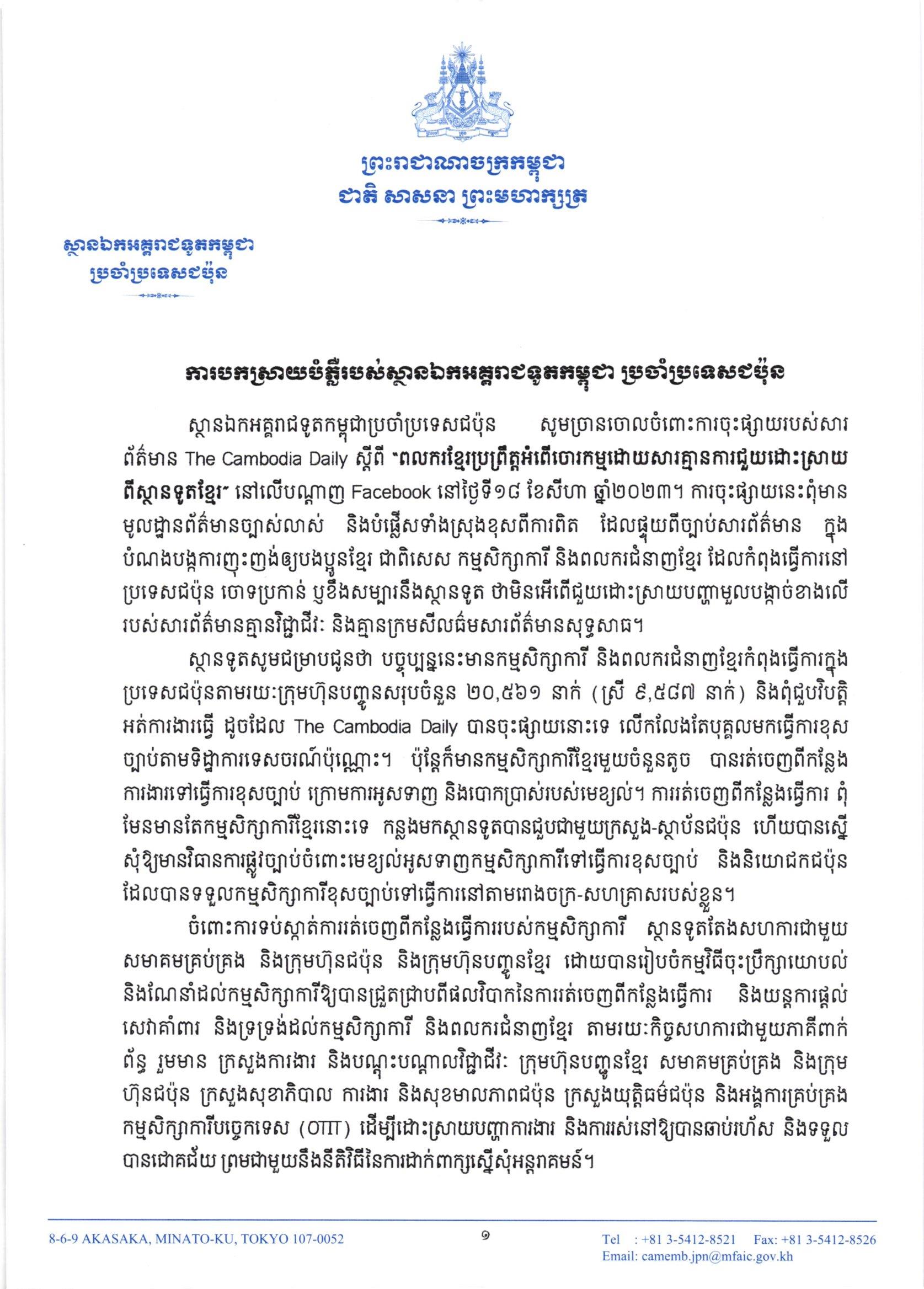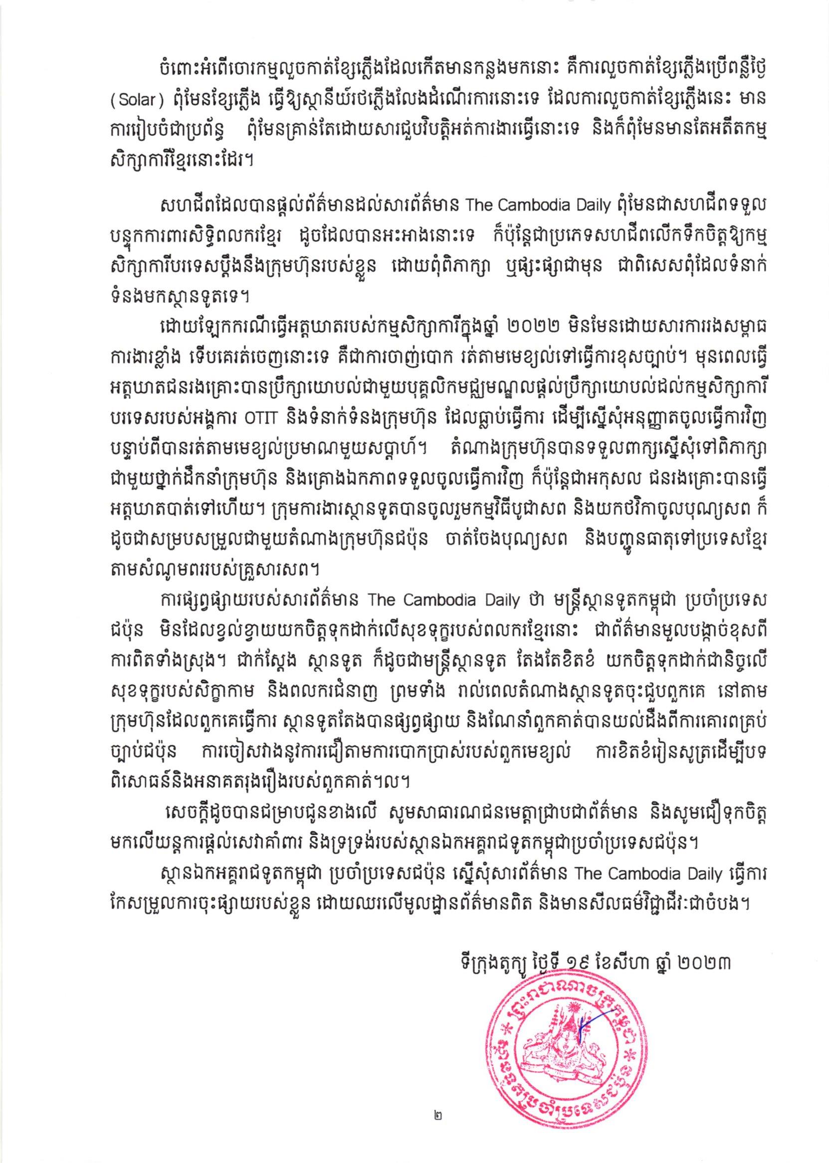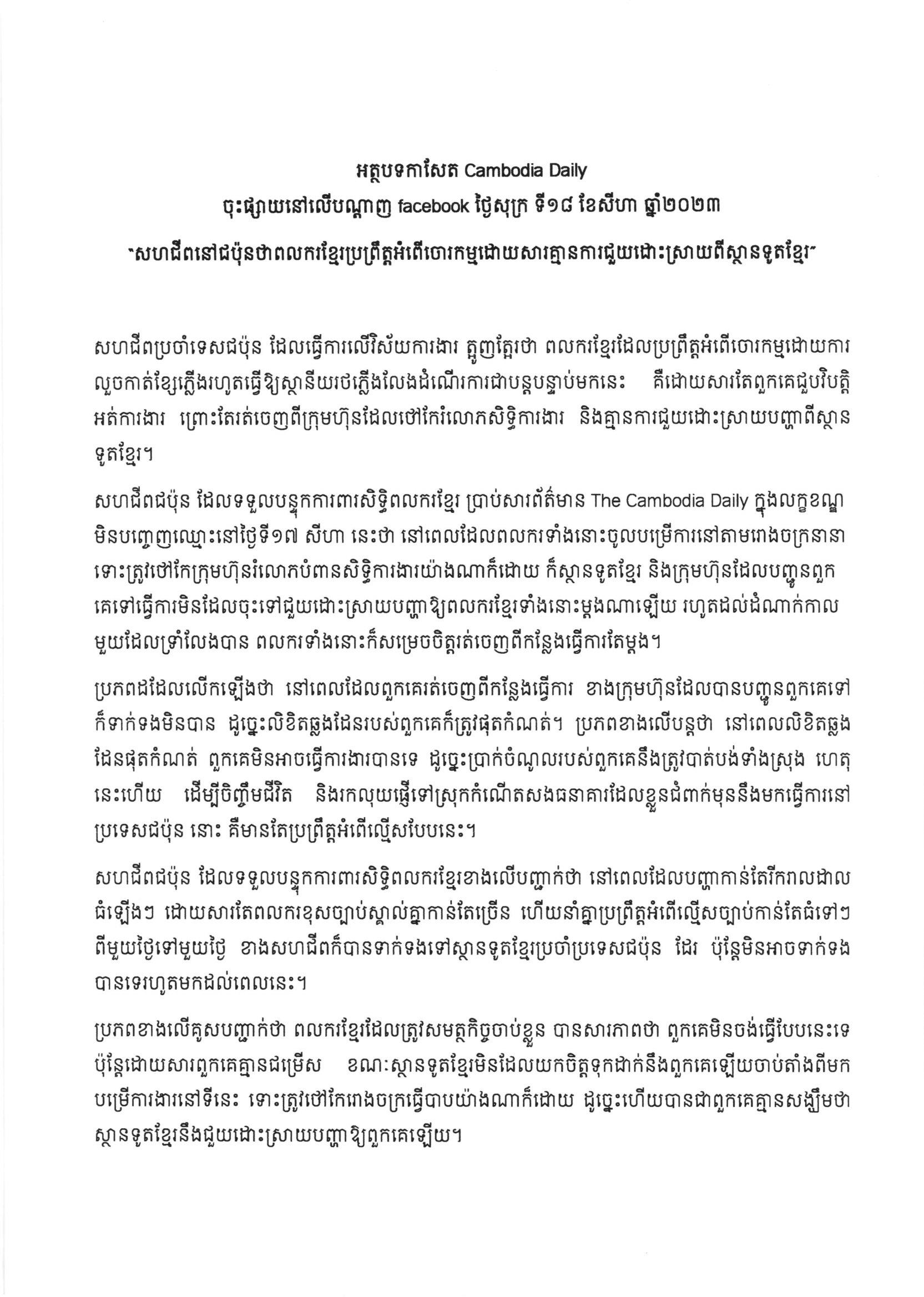 ការបញ្ជាក់របស់ស្ថានទូតកម្ពុជាប្រចាំនៅប្រទេសជប៉ុន ជាការឆ្លើយតបនឹងការចុះផ្សាយរបស់កាសែត Cambodia Daily ក្រោមចំណងជើងថា ពលករខ្មែរប្រព្រឹត្តអំពើចោរកម្ម ដោយសារគ្មានការជួយដោះស្រាយពីស្ថានទូតខ្មែរ នៅថ្ងៃទី១៨ ខែសីហា ឆ្នាំ២០២៣។