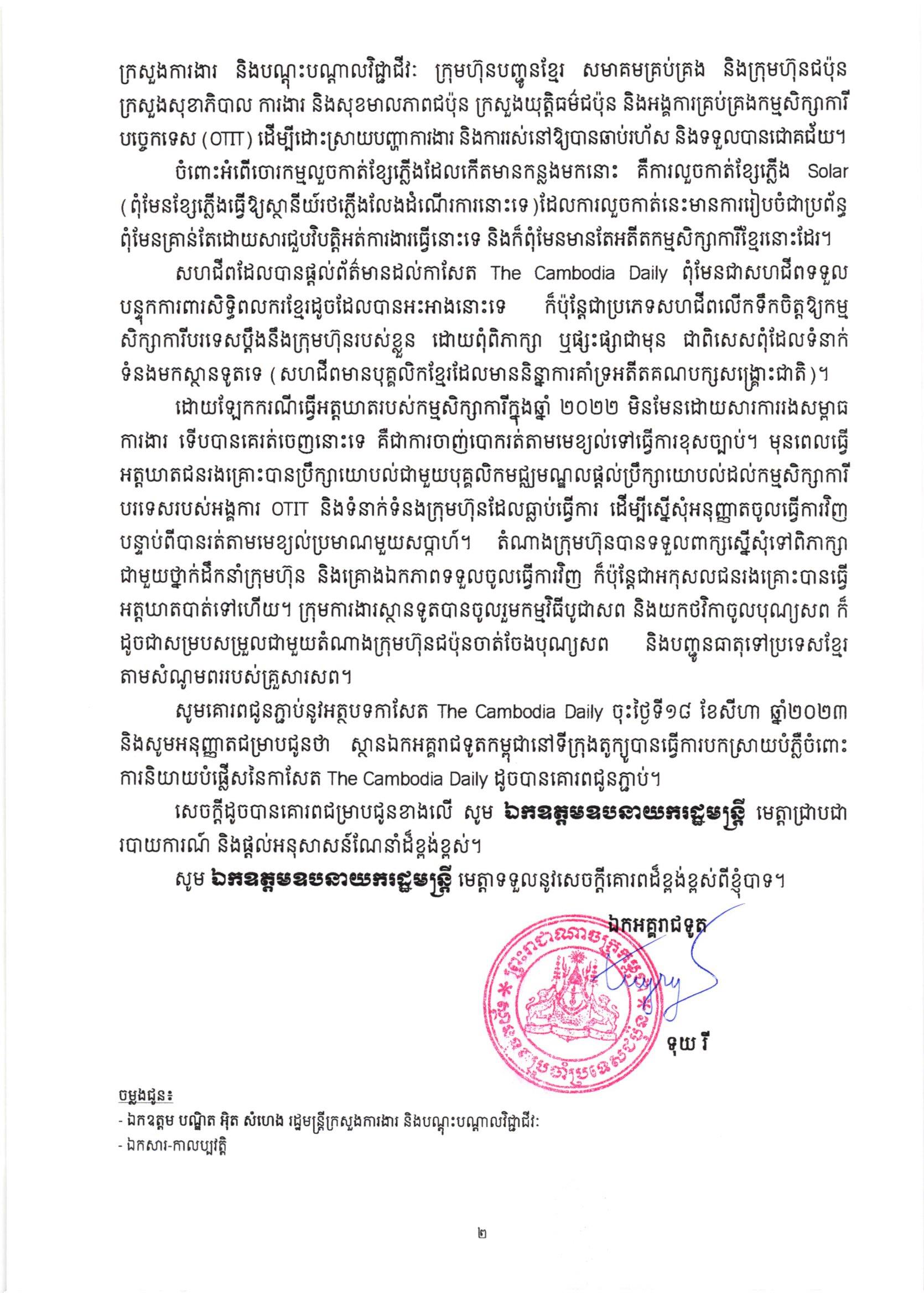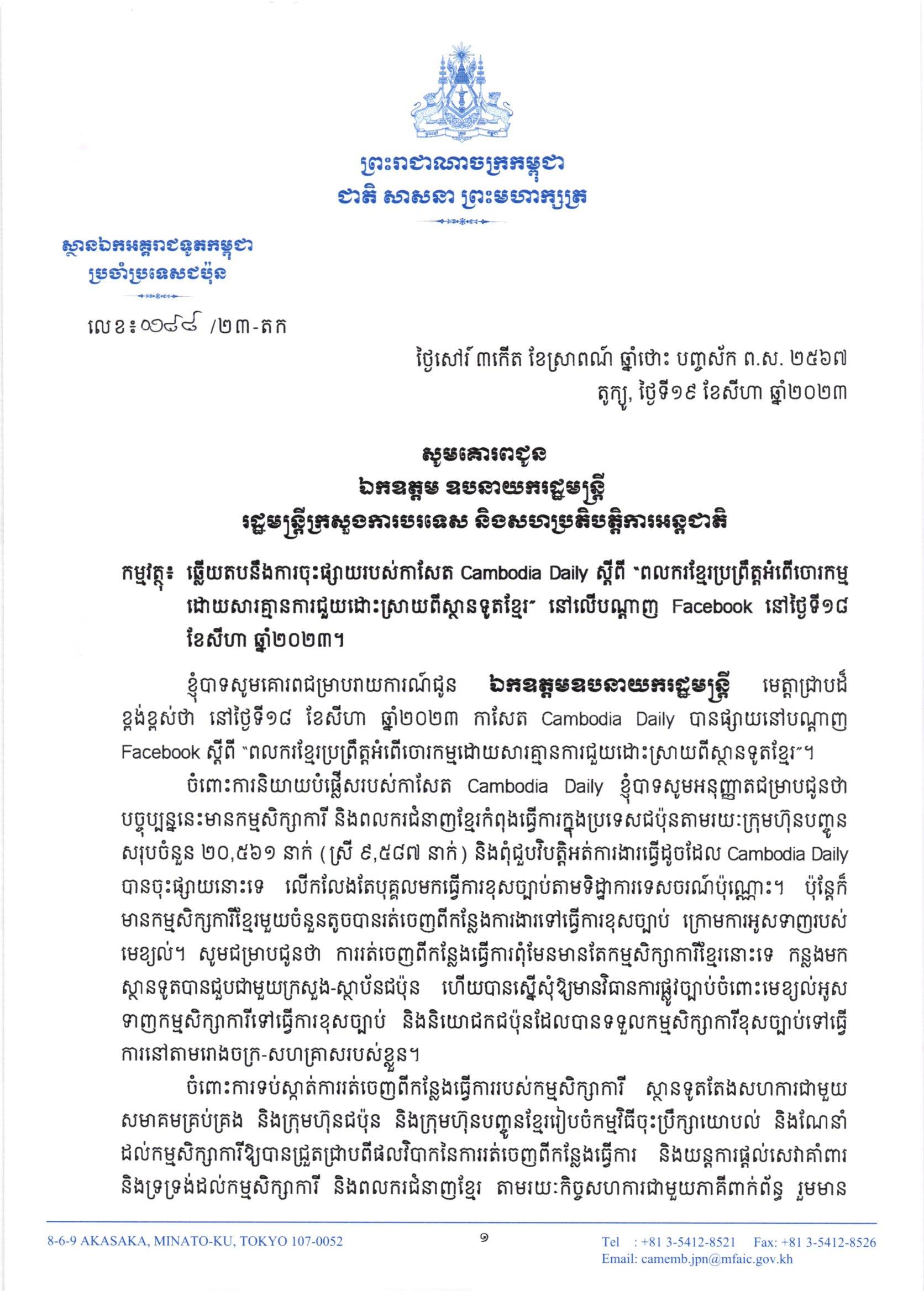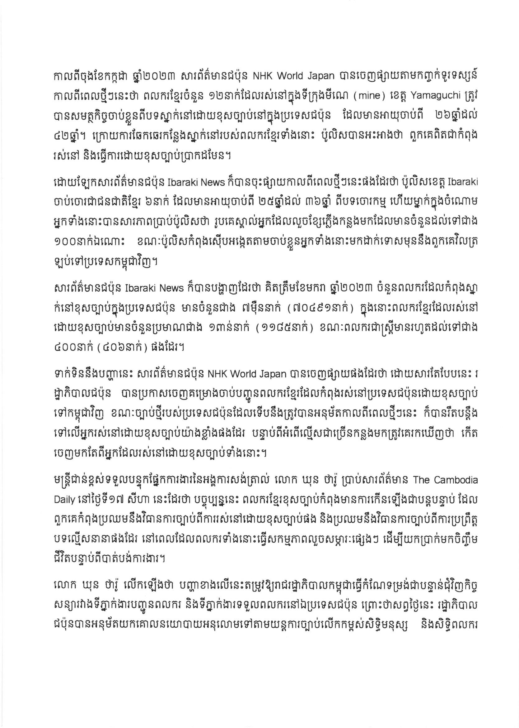 ការបញ្ជាក់របស់ស្ថានទូតកម្ពុជាប្រចាំនៅប្រទេសជប៉ុន ជាការឆ្លើយតបនឹងការចុះផ្សាយរបស់កាសែត Cambodia Daily ក្រោមចំណងជើងថា ពលករខ្មែរប្រព្រឹត្តអំពើចោរកម្ម ដោយសារគ្មានការជួយដោះស្រាយពីស្ថានទូតខ្មែរ នៅថ្ងៃទី១៨ ខែសីហា ឆ្នាំ២០២៣។
