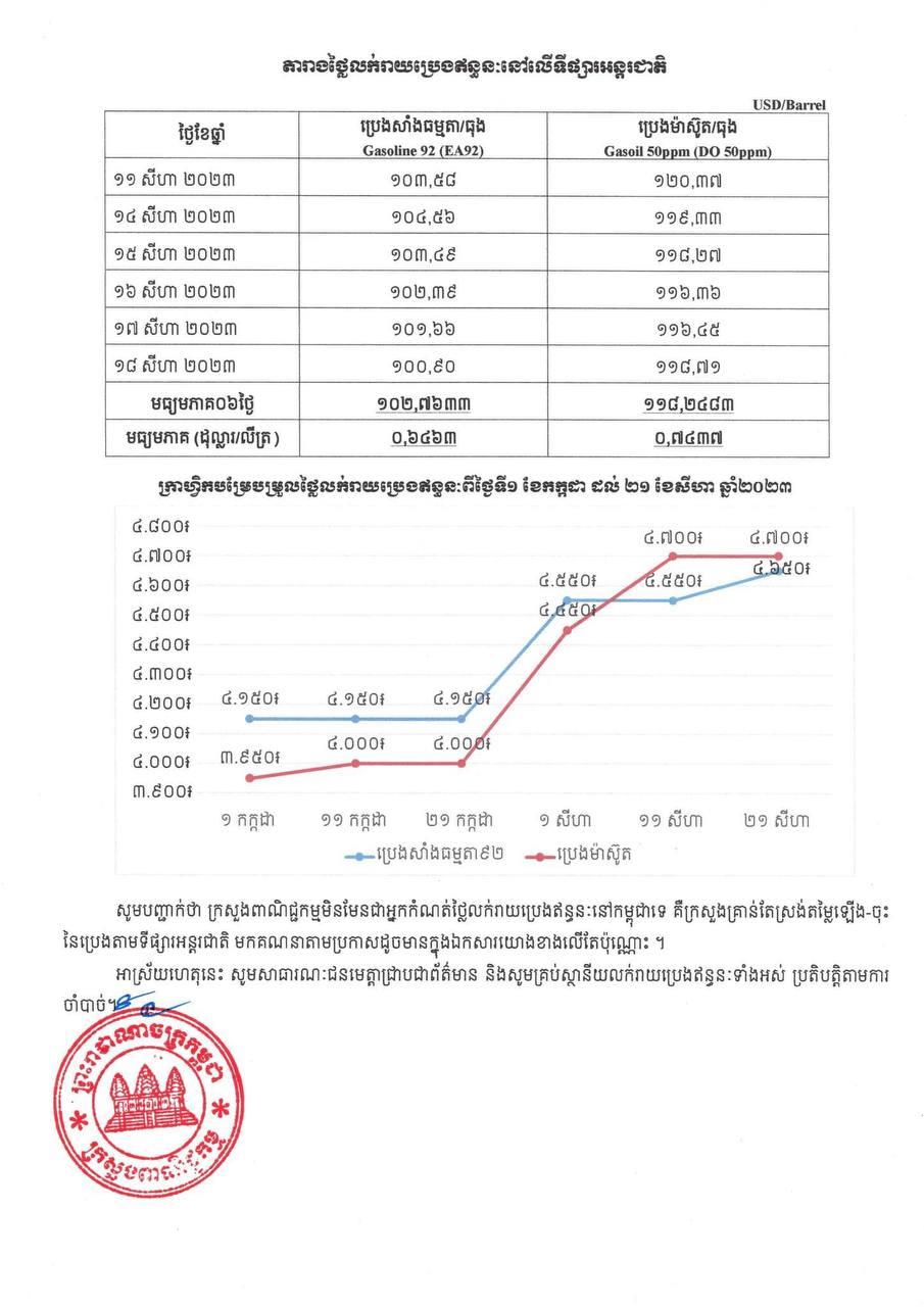 ក្រសួងពាណិជ្ជកម្ម៖ តម្លៃសាំងធម្មតាត្រូវលក់តម្លៃ ៤,៦៥០រៀល និងម៉ាស៊ូតលក់តម្លៃ ៤,៧០០រៀល ចាប់ពីថ្ងៃនេះ ដល់ថ្ងៃទី៣១ ខែសីហា ឆ្នាំ២០២៣