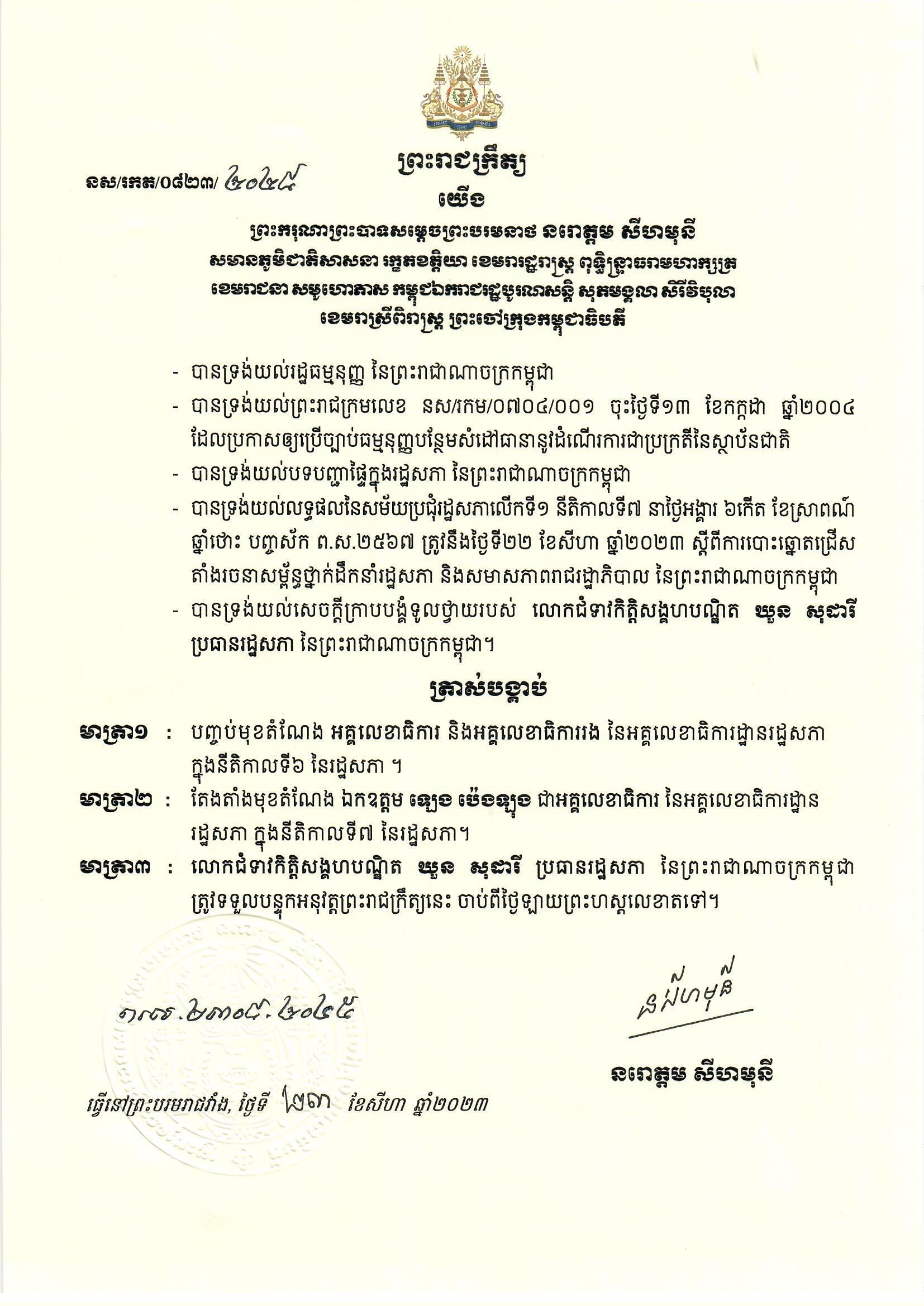 ព្រះមហាក្សត្រ ចេញព្រះរាជក្រឹត្យ ត្រាស់បង្គាប់តែងតាំង លោក ឡេង ប៉េងឡុង ជាអគ្គលេខាធិការរដ្ឋសភា នីតិកាលទី៧