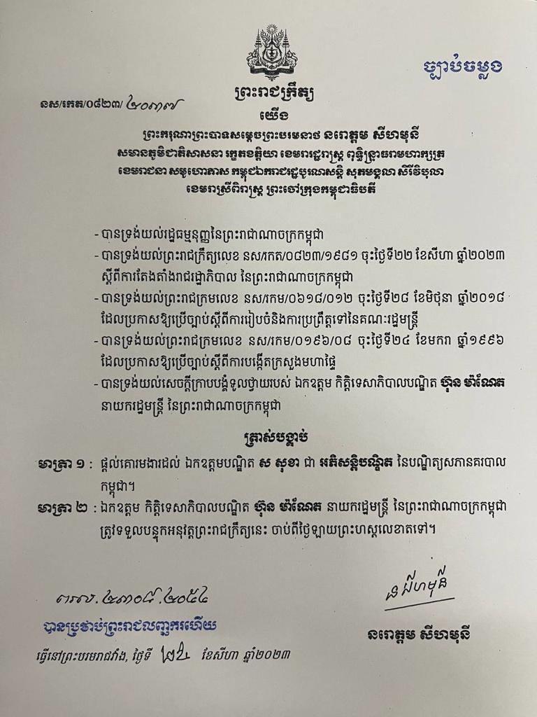 (ភ្នំពេញ)៖ ព្រះករុណា ព្រះបាទ សម្តេចព្រះបរមនាថ នរោត្តម សីហមុនី ព្រះមហាក្សត្រនៃព្រះរាជាណាចក្រកម្ពុជា បានត្រាស់បង្គាប់ផ្តល់គោរមងារ «អភិសន្តិបណ្ឌិត» នៃបណ្ឌិត្យសភានគរបាលកម្ពុជា ជូនឯកឧត្តមបណ្ឌិត ស សុខា ឧបនាយករដ្ឋមន្ត្រី រដ្ឋមន្ត្រីក្រសួងមហាផ្ទៃ។ នេះបើតាមព្រះរាជក្រឹត្យ ដែលបណ្តាញព័ត៌មាន Fresh News ទទួលបាននៅថ្ងៃទី២៥ ខែសីហា ឆ្នាំ២០២៣នេះ៕