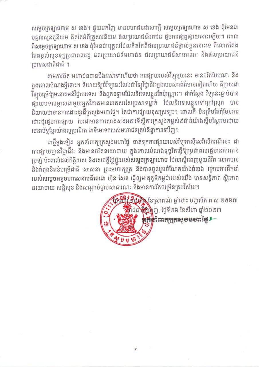 អ្នកនាំពាក្យក្រសួងមហាផ្ទៃ ច្រានចោលការចុះផ្សាយរបស់វិទ្យុអាស៊ីសេរី ដែលមានចរិតនយោបាយ ក្នុងគោលបំណងទុច្ចរិត ធ្វើឱ្យប៉ះពាល់ដល់កិត្តិយស និងសេចក្តីថ្លៃថ្នូររបស់សម្ដេចក្រឡាហោម ស ខេង
