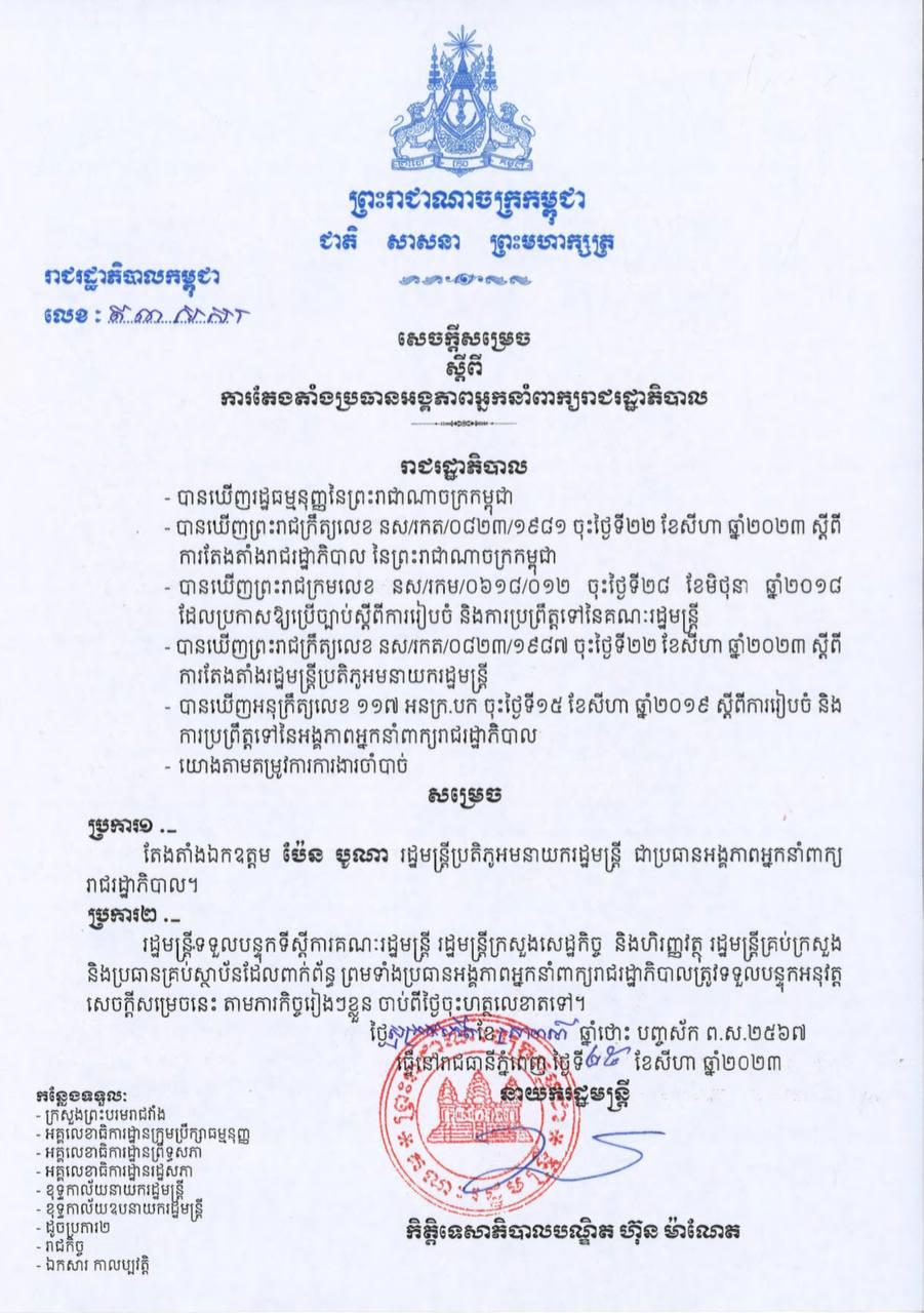 ខាងក្រោមនេះជាសេចក្តីសម្រេចរបស់រាជរដ្ឋាភិបាល៖