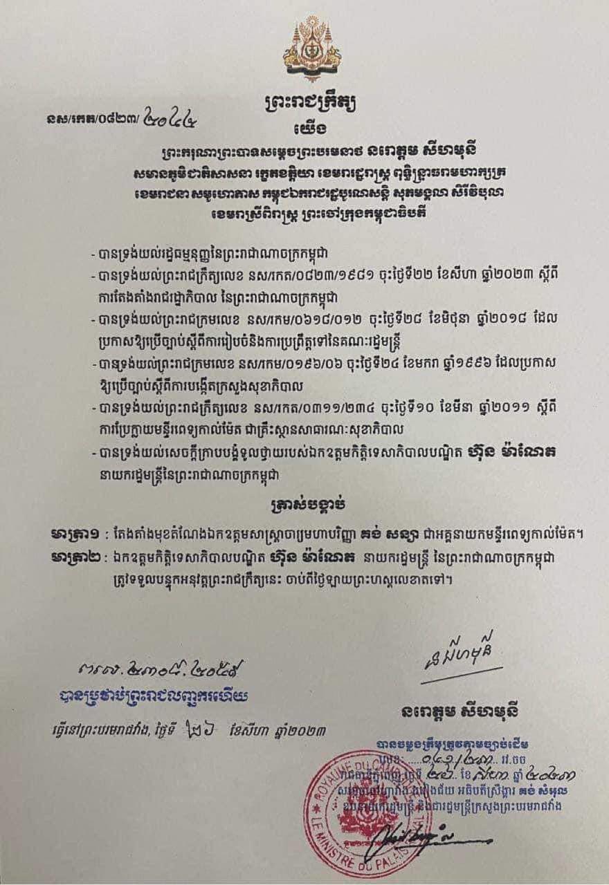 ព្រះមហាក្សត្រ ចេញព្រះរាជក្រឹត្យតែងតាំង សាស្ដ្រាចារ្យមហាបរិញ្ញា គង់ សន្យា ជាអគ្គនាយកមន្ទីរពេទ្យកាល់ម៉ែត