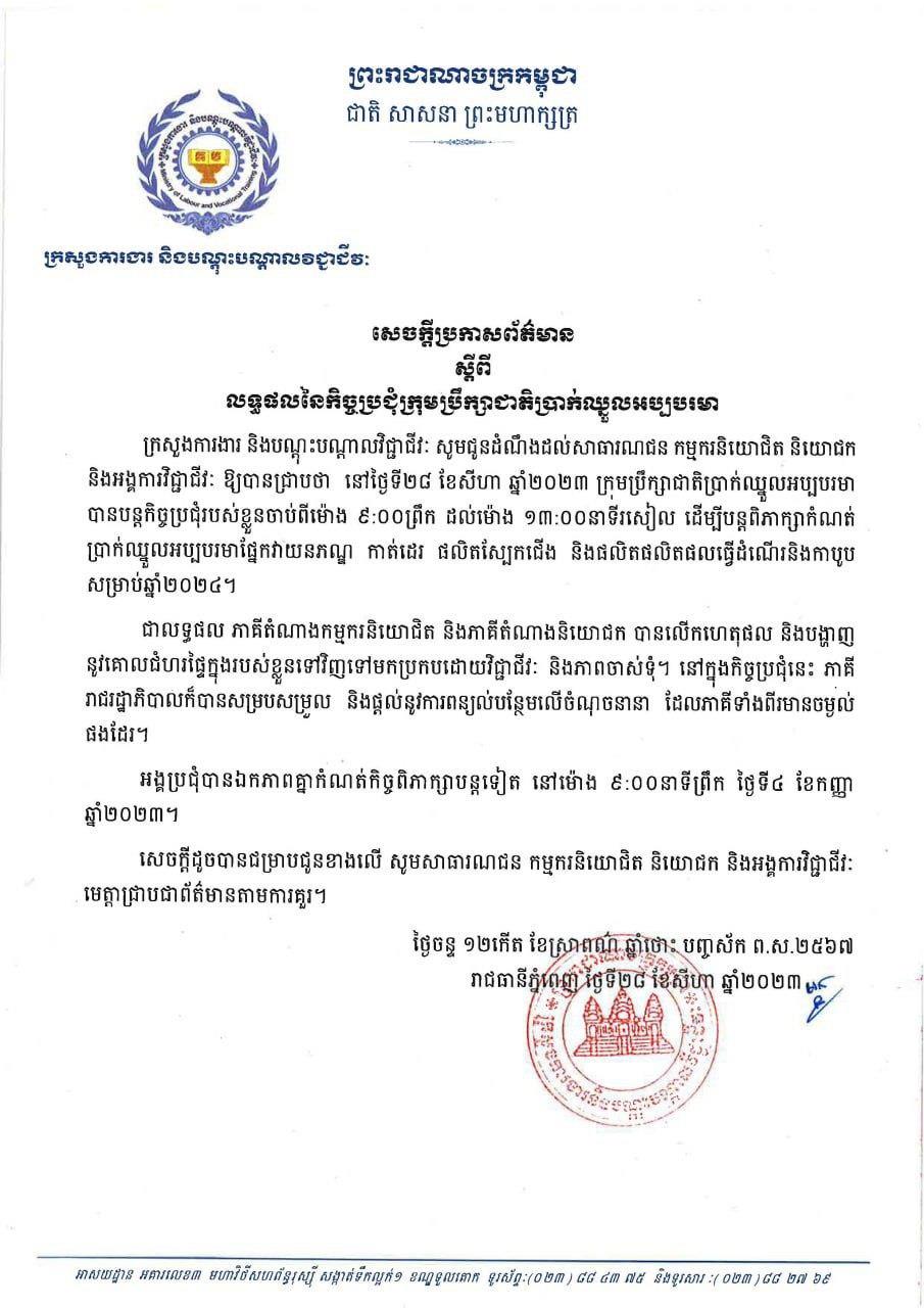 ខាងក្រោមនេះជាសេចក្ដីសេចក្ដីប្រកាសព័ត៌មាន ស្ដីពីលទ្ធផលនៃកិច្ចប្រជុំក្រុមប្រឹក្សាជាតិប្រាក់ឈ្នួលអប្បបរមាអាណត្តិទី៣ លើកទី២៖