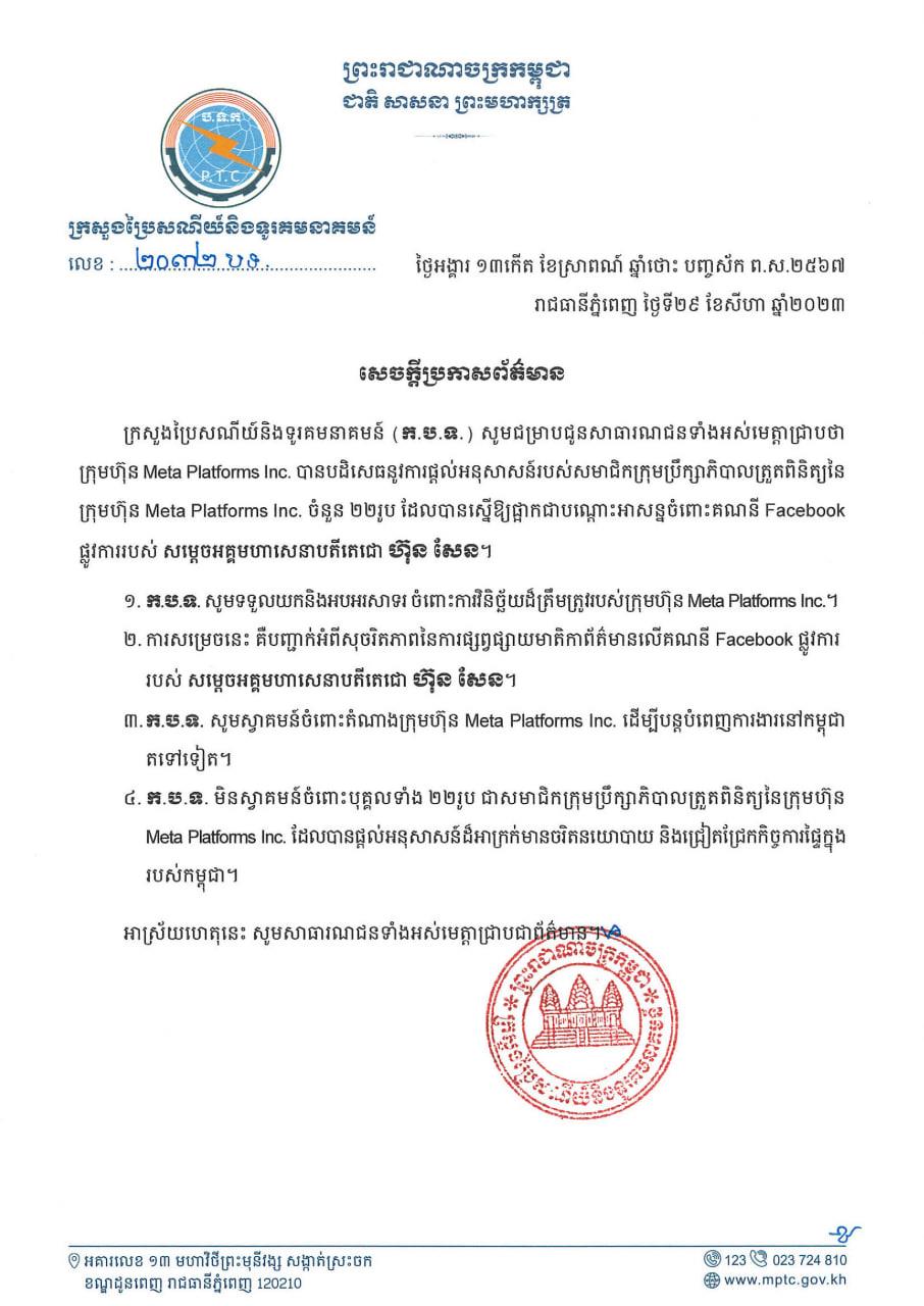 ក្រសួងប្រៃសណីយ៍ និងទូរគមនាគមន៍ (ក.ប.ទ.) បានបញ្ជាក់ថា ក្រុមហ៊ុន Meta Platforms Inc. បានបដិសេធនូវការផ្ដល់អនុសាសន៍របស់សមាជិកក្រុមប្រឹក្សាភិបាលត្រួតពិនិត្យនៃក្រុមហ៊ុន Meta Platforms Inc. ចំនួន ២២រូប ដែលបានស្នើឱ្យផ្អាកជាបណ្ដោះអាសន្នចំពោះគណនី Facebook ផ្លូវការរបស់ សម្ដេចអគ្គមហាសេនាបតីតេជោ ហ៊ុន សែន។
