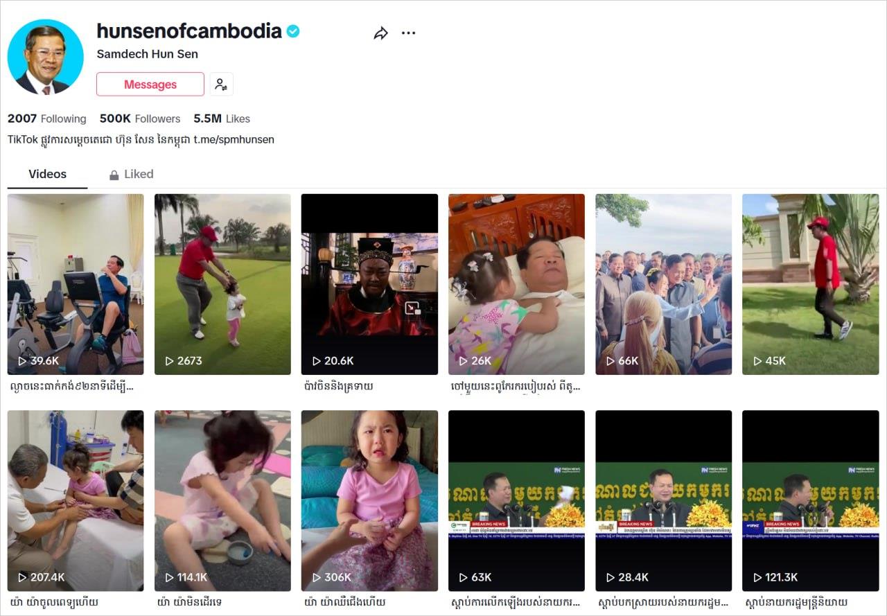 TikTok ផ្លូវការសម្តេចតេជោ ហ៊ុន សែន មាន Follower កើនឡើងរហូតដល់ជាង 500K ក្នុងរយៈពេលខ្លីតែប៉ុណ្ណោះ ខណៈវិដេអូចៅស្រីសម្តេច ផ្ទុះការចំណាប់អារម្មណ៍ខ្លាំងជាងគេ ដោយមានអ្នកមើលជាង 7.4M
