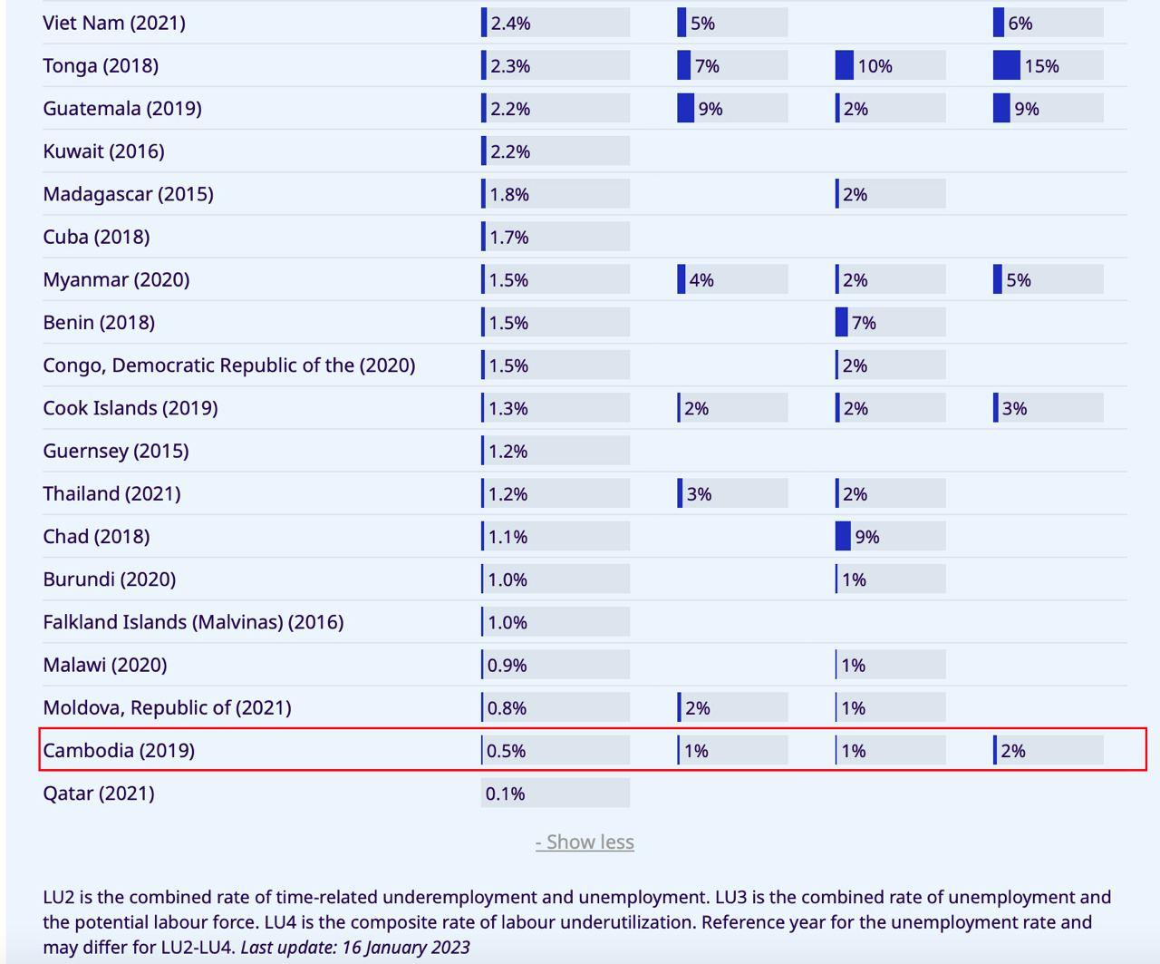 (ភ្នំពេញ)៖ អង្គការអន្តរជាតិខាងការងារ ILO បានបង្ហាញរបាយការណ៍ផ្លូវការបស់ខ្លួនថា កម្ពុជាជាប្រទេសដែលមានអត្រាអត់ការងារធ្វើតិចបំផុតត្រឹម ០.៥% ប៉ុណ្ណោះ ដែលមានន័យថា អ្នកមានការងារធ្វើមានរហូតដលើ ៩៩.៥% ដែលឈរនៅលំដាប់ទី២ បន្ទាប់ពីប្រទេសកាតា (០.១%) ដែលមានអត្រាអ្នកអត់ការងារទាបជាងគេក្នុងចំណោម១៨៥ប្រទេស។