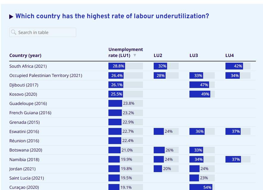 តាមរយៈរបាយការណ៍ដែលអង្គការអន្តរជាតិខាងការងារ (ILO) បានរកឃើញធ្វើឡើងនៅក្នុងឆ្នាំ២០១៩ អង្គការអន្តរជាតិខាងការងារ (ILO) ក៏បានបញ្ជាក់ថា ប្រទេសដែលមានអត្រាការងារធ្វើខ្ពស់ផ្សេងៗទៀត រួមមាន៖ កាតា ម៉ុលដូវ៉ា ម៉ាឡាវី ប៊ូរុនឌី ឆាដ ថៃ អាល្លឺម៉ង់ជាដើម សុទ្ធតែជាប្រទេសដែលមានអត្រាអត់ការងារធ្វើតិចតួច។