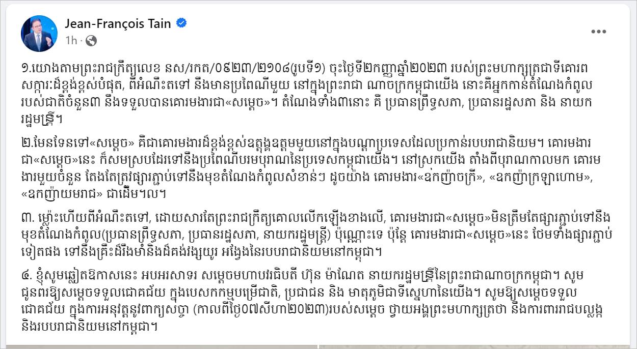 លោក ហ្សង់ ហ្វ្រង់ស័រ តាន់៖ គោរមងារជា«សម្តេច» មិនត្រឹមតែភ្ជាប់នឹងមុខតំណែងកំពូលប៉ុណ្ណោះទេ ថែមទាំងផ្សារភ្ជាប់ទៅនឹងគ្រឹះដ៏រឹងមាំ និងដ៏គង់វង្សយូរអង្វែងនៃរបបរាជានិយមនៅកម្ពុជាទៀតផង